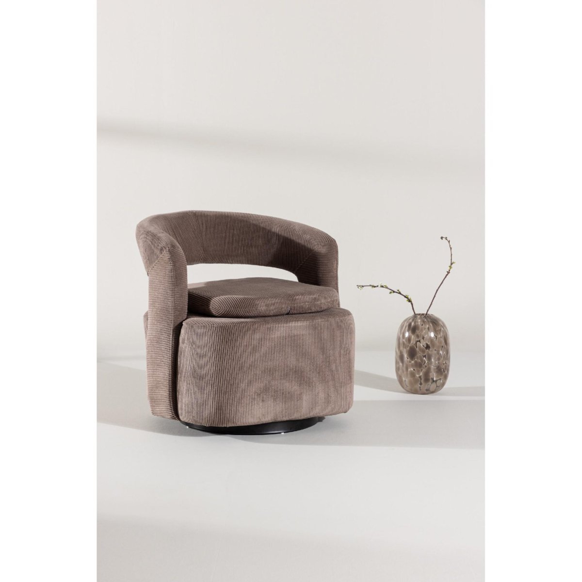 Door de compacte afmetingen en het tijdloze design laat deze bruine draaifauteuil zich moeiteloos combineren met uiteenlopende woonstijlen: van modern en Scandinavisch tot industrieel of hotel chique. De bruine ribstof brengt direct warmte, sfeer en diepte in een interieur met neutrale of koele tinten, en matcht net zo goed met zwart staal, hout, natuursteen en andere natuurlijke materialen. Plaats de fauteuil naast de bank met een plaid, bijzettafel en vloerlamp en je creëert in een handomdraai een uitnodigende leeshoek. In de slaapkamer functioneert hij als elegante accentstoel of comfortabele plek om even te ontspannen, terwijl je in een home office profiteert van de draaifunctie om soepel te wisselen tussen bureau, kast en vergaderopstelling. Zo biedt deze moderne draaifauteuil een perfecte mix van flexibiliteit, ondersteuning en design, zonder concessies te doen aan functionaliteit of zitkwaliteit.