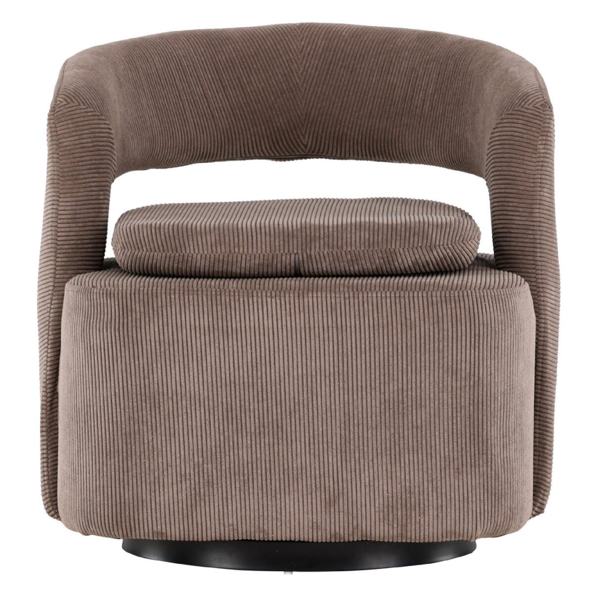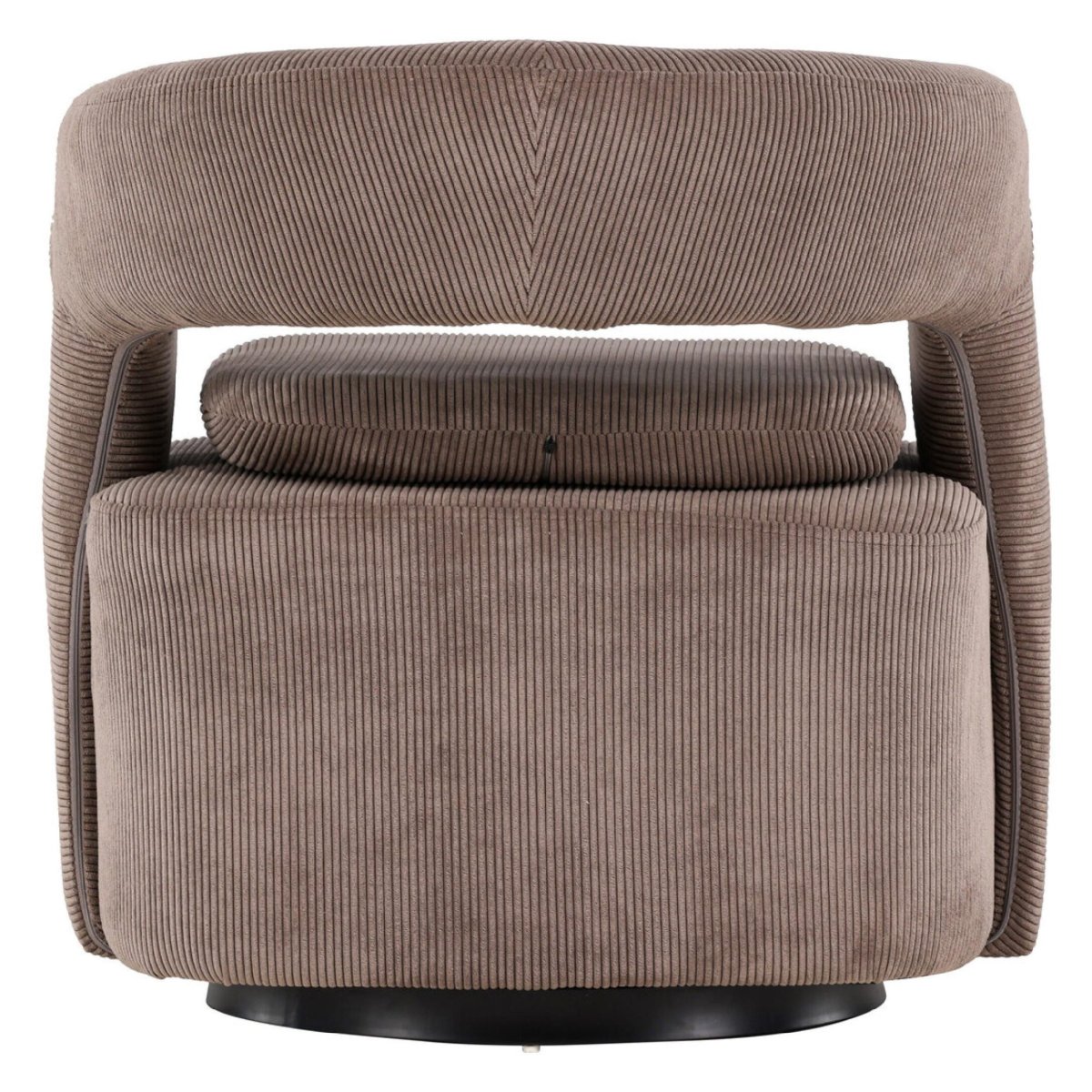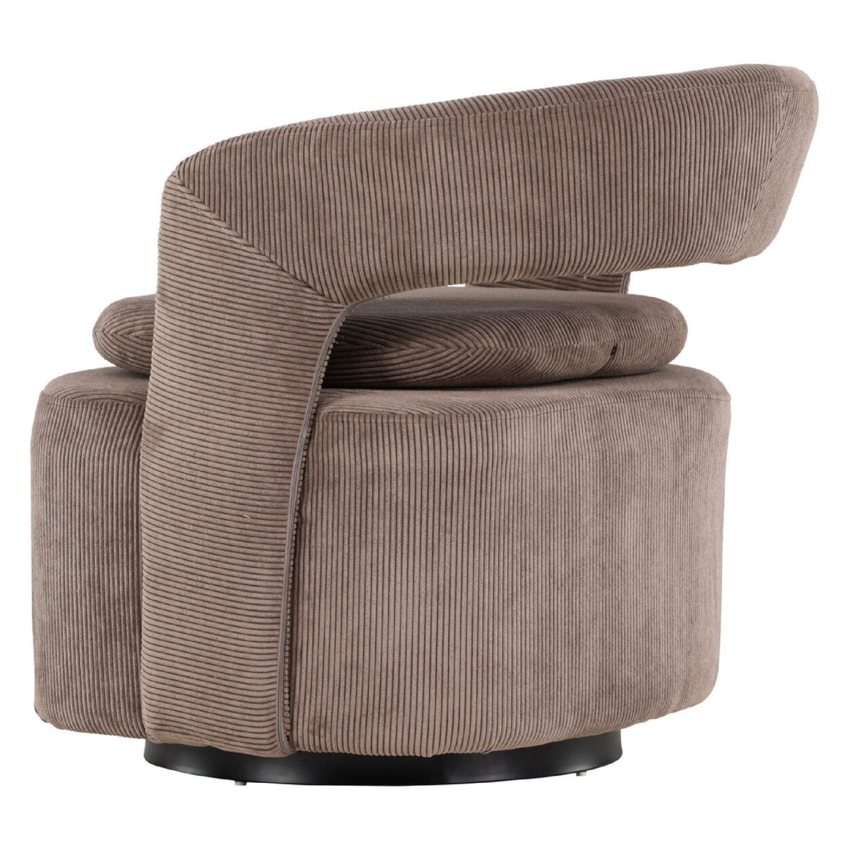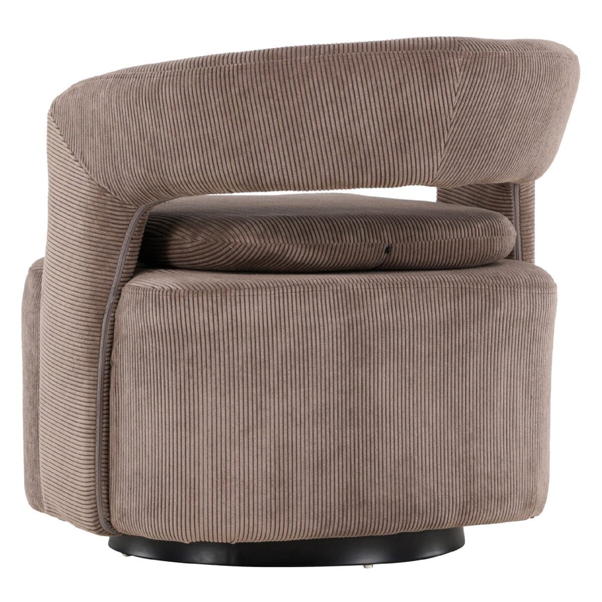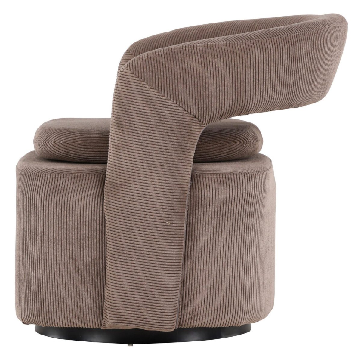 Deze draaibare fauteuil in bruine ribstof is een moderne lounge stoel met een afgeronde rugleuning, royale zit en een stevig zwart stalen onderstel. De warme aardetint sluit naadloos aan bij een eigentijds interieur, terwijl de zachte ribstof en comfortabele schuimvulling zorgen voor optimaal zitcomfort. Dankzij de soepele draaifunctie draai je eenvoudig mee met het gesprek of de ruimte, ideaal als draaifauteuil in de woonkamer, leeshoek, studio of home office. De strakke lijnen, het minimalistische frame en de onderhoudsvriendelijke stof maken deze design fauteuil zowel stijlvol als praktisch in dagelijks gebruik.