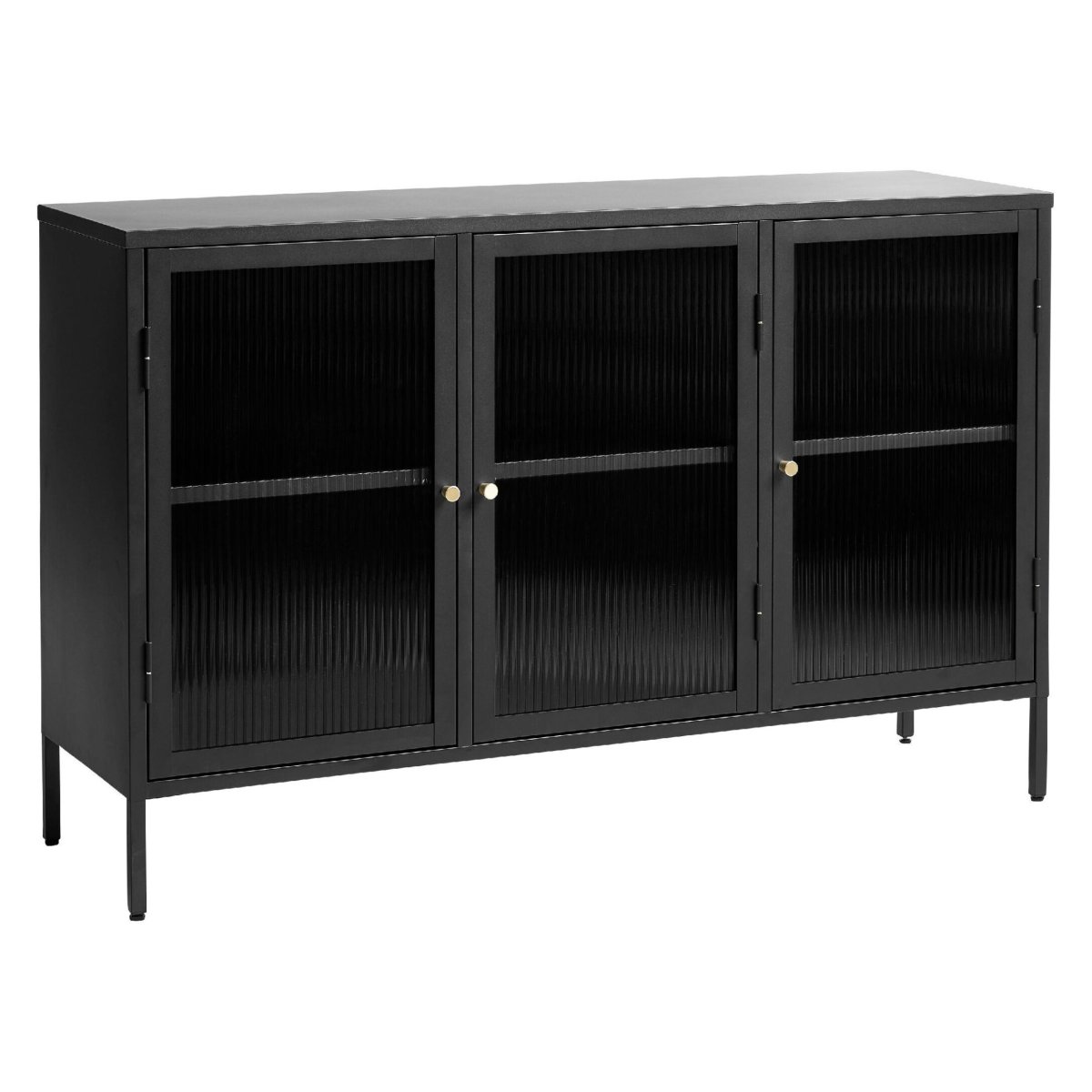 Een modern, industrieel dressoir met royale opbergruimte en de luxe uitstraling van een vitrinekast. Dit zwarte metalen meubel heeft een stevig, minimalistisch frame met drie deuren van geribbeld glas en elegante goudkleurige handgrepen. Het fluted glass verzacht zicht en licht, zodat je spullen subtiel aan het oog onttrokken worden terwijl de kast toch transparant en ruimtelijk oogt. Achter de deuren bevinden zich zes overzichtelijke vakken waarin je accessoires, servies, glazen en woondecoratie netjes kunt organiseren. Dankzij de strakke lijnen en tijdloze kleurstelling past dit dressoir naadloos in een modern, industrieel, minimalistisch of Scandinavisch interieur en tover je je woonkamer, eetkamer of hal direct om in een opgeruimde, sfeervolle ruimte.
