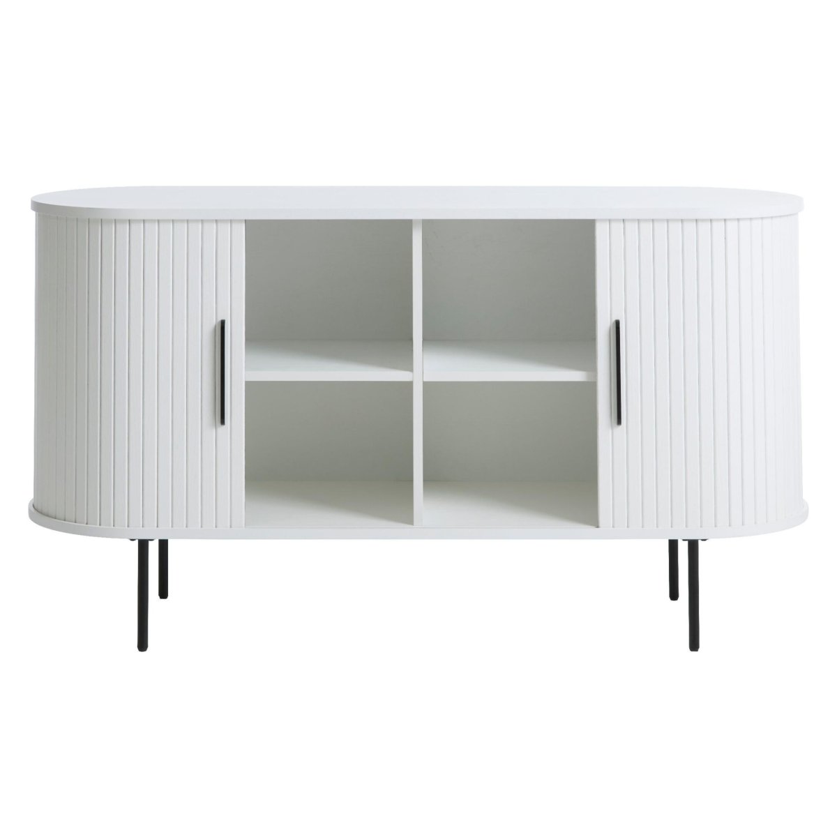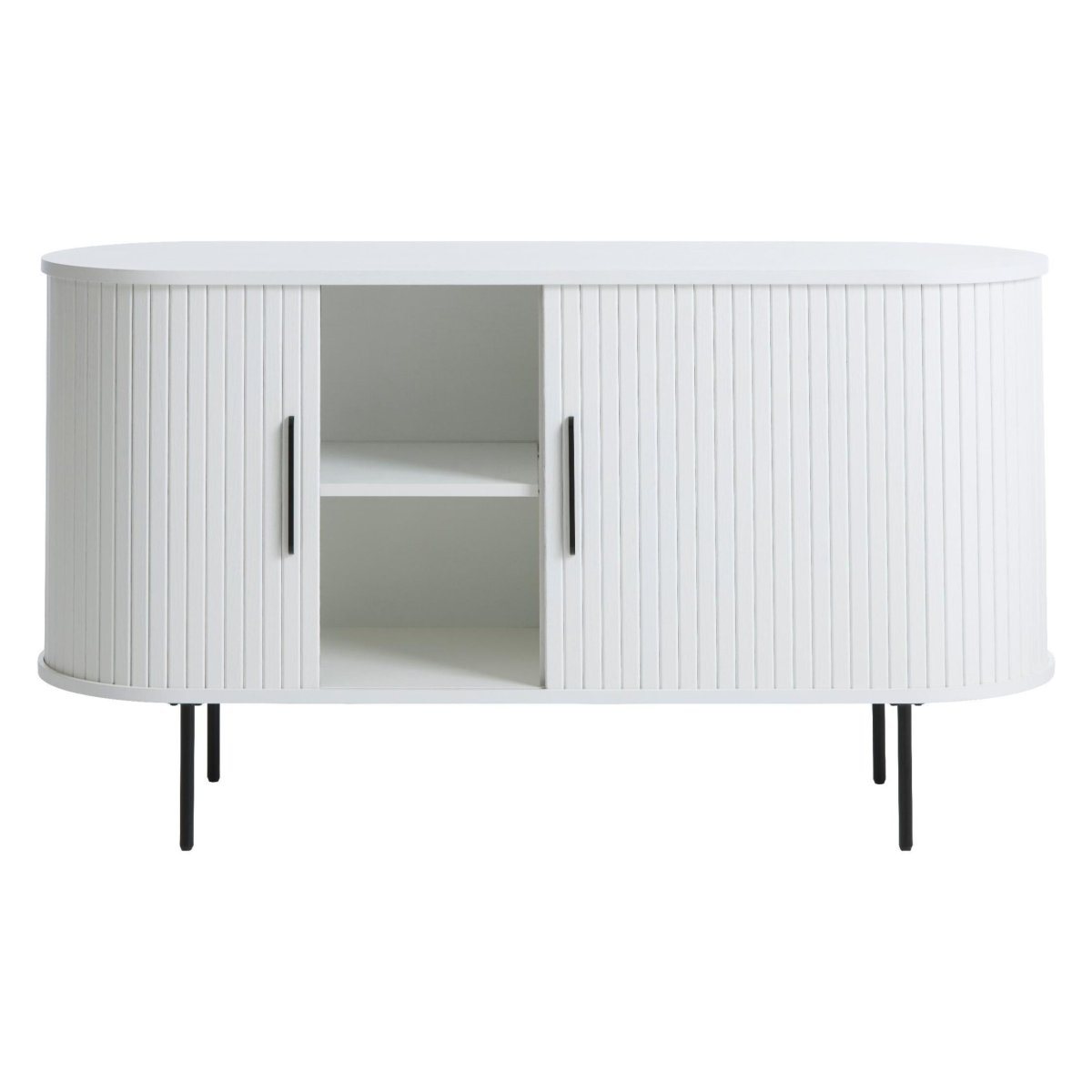 Strak, tijdloos en functioneel: dit compacte dressoir in wit eiken met zwarte metalen poten en twee schuifdeuren is een blikvanger in elke moderne woonkamer. De afgeronde vorm en verticale lamellen geven het meubel een zachte, stijlvolle uitstraling die perfect past in een Scandinavisch, modern of minimalistisch interieur. Met een breedte van 120 cm, diepte van 45 cm en hoogte van 76 cm biedt dit dressoir royale opbergruimte, zonder zwaar of massief over te komen. Ideaal voor woonkamer, eetkamer of hal: servies, boeken en accessoires berg je netjes uit het zicht op, terwijl het bovenblad ruimte biedt voor lampen, planten of decoratie. De rustige PU-lak in RAL 9003 (gloss 10%) en het eikenfineer zorgen voor een hoogwaardige, duurzame look die lang mooi blijft.