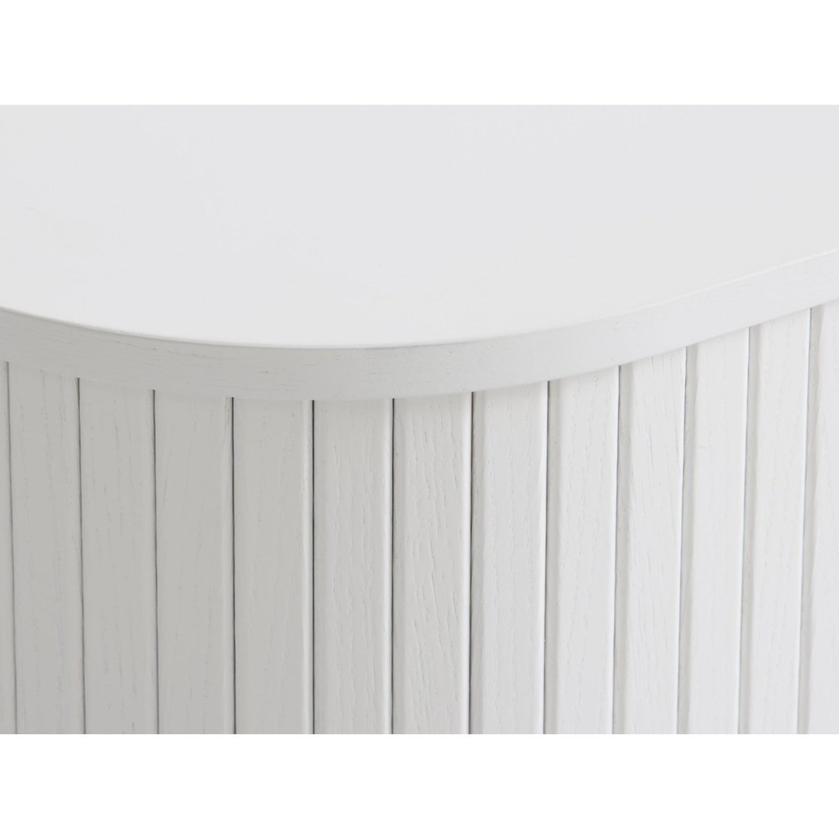 De afgeronde body en verticale lamellen aan de fronten geven dit witte eiken dressoir een luxueuze, salonwaardige uitstraling. De lichte houtkleur oogt fris en ruimtelijk, terwijl de zwarte metalen poten en handgrepen voor een krachtig, grafisch contrast zorgen. Daardoor combineer je dit meubel moeiteloos met lichte muren, natuurlijke materialen, zachte stoffen en andere zwarte accenten in huis. Dankzij de lage glansgraad van de lak blijft het houtbeeld mooi zichtbaar en krijgt het dressoir een subtiel, hoogwaardig karakter. Het afgeronde silhouet maakt de kast vriendelijk in smalle doorgangen en langs looproutes, zonder scherpe hoeken. Zo voeg je een stijlvol statement toe dat rust, eenheid en sfeer brengt in je interieur.