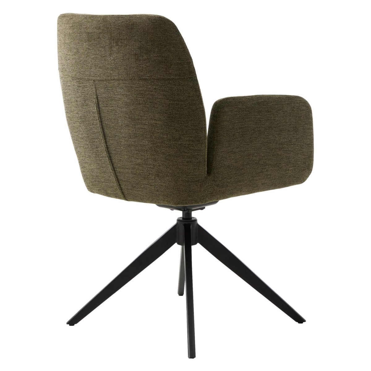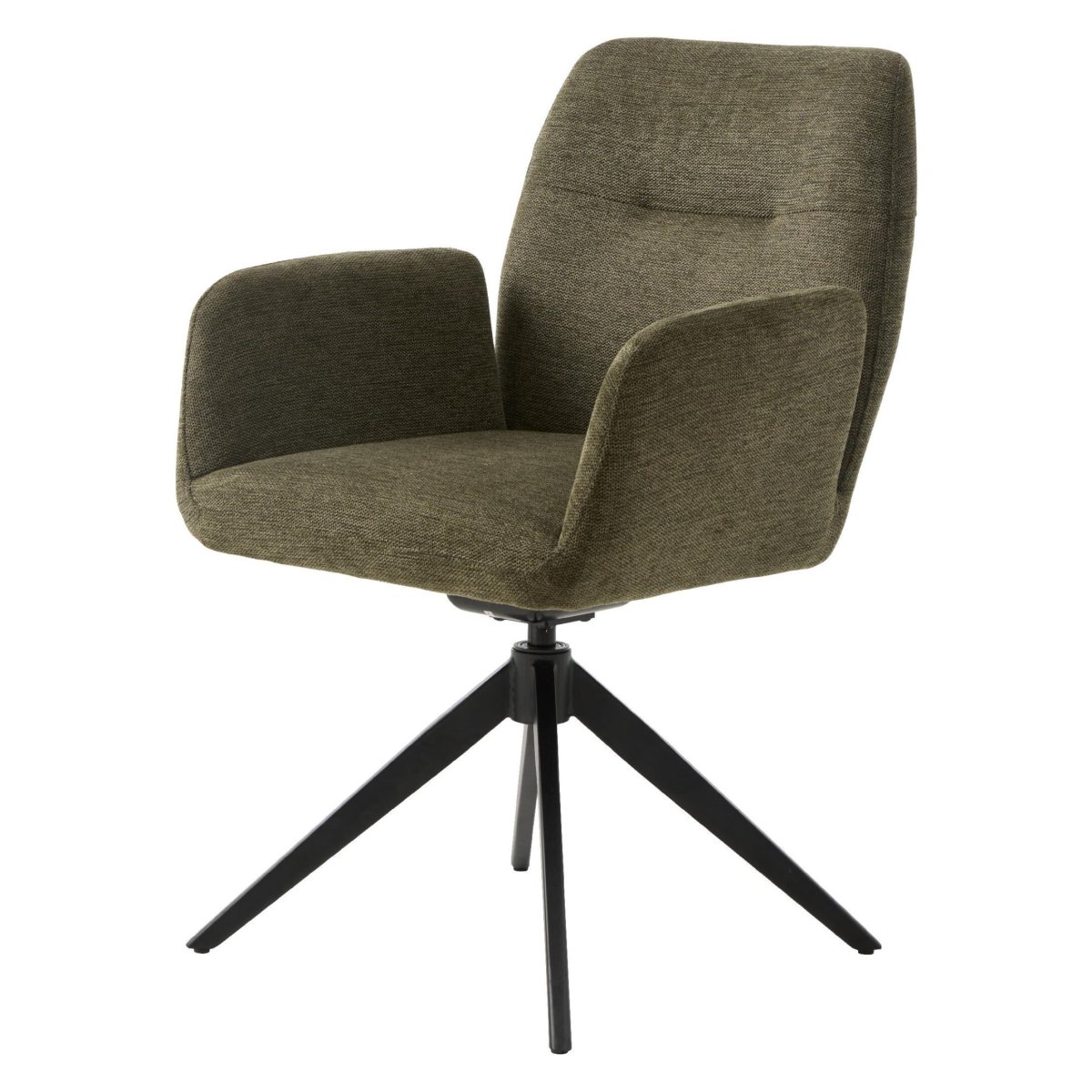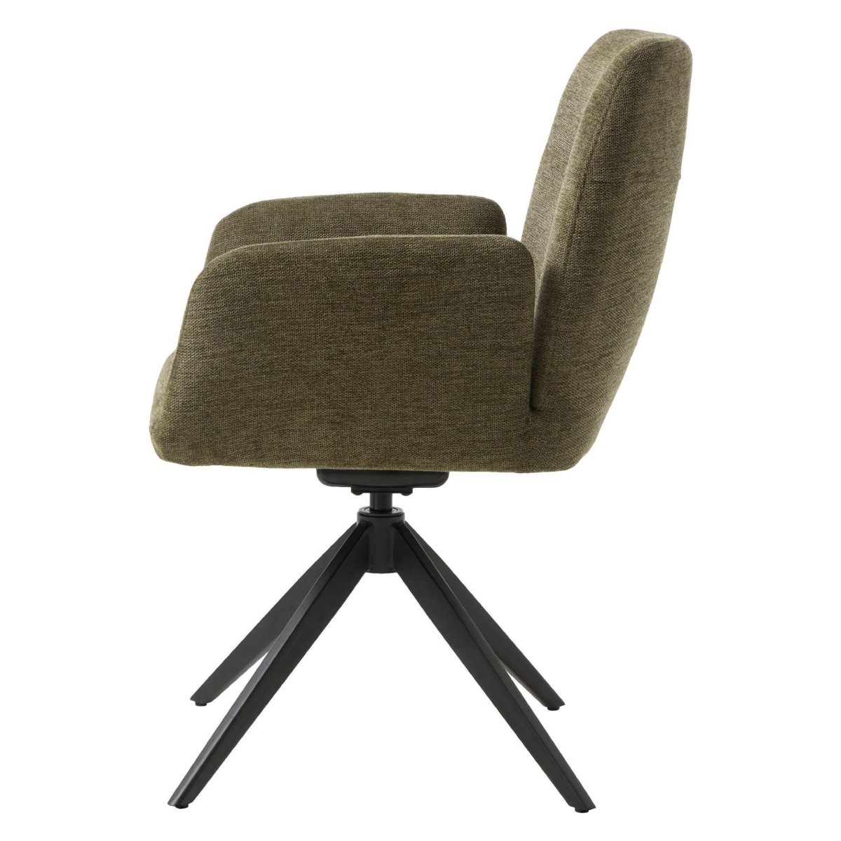 Deze gestoffeerde eetkamerstoel met armleuning combineert hoog zitcomfort met een modern, draaibaar design. De zachte zitting en ergonomische rugleuning bieden optimale ondersteuning tijdens lange diners, terwijl de 4-poots draaivoet van staal soepel meebeweegt. De olijfgroene stof geeft je eethoek of keuken een warme, natuurlijke uitstraling, terwijl de zwarte poten zorgen voor een strakke, eigentijdse look. Zo haal je een comfortabele, draaibare armstoel in huis die perfect past in uiteenlopende interieurstijlen, van modern en Scandinavisch tot industrieel.