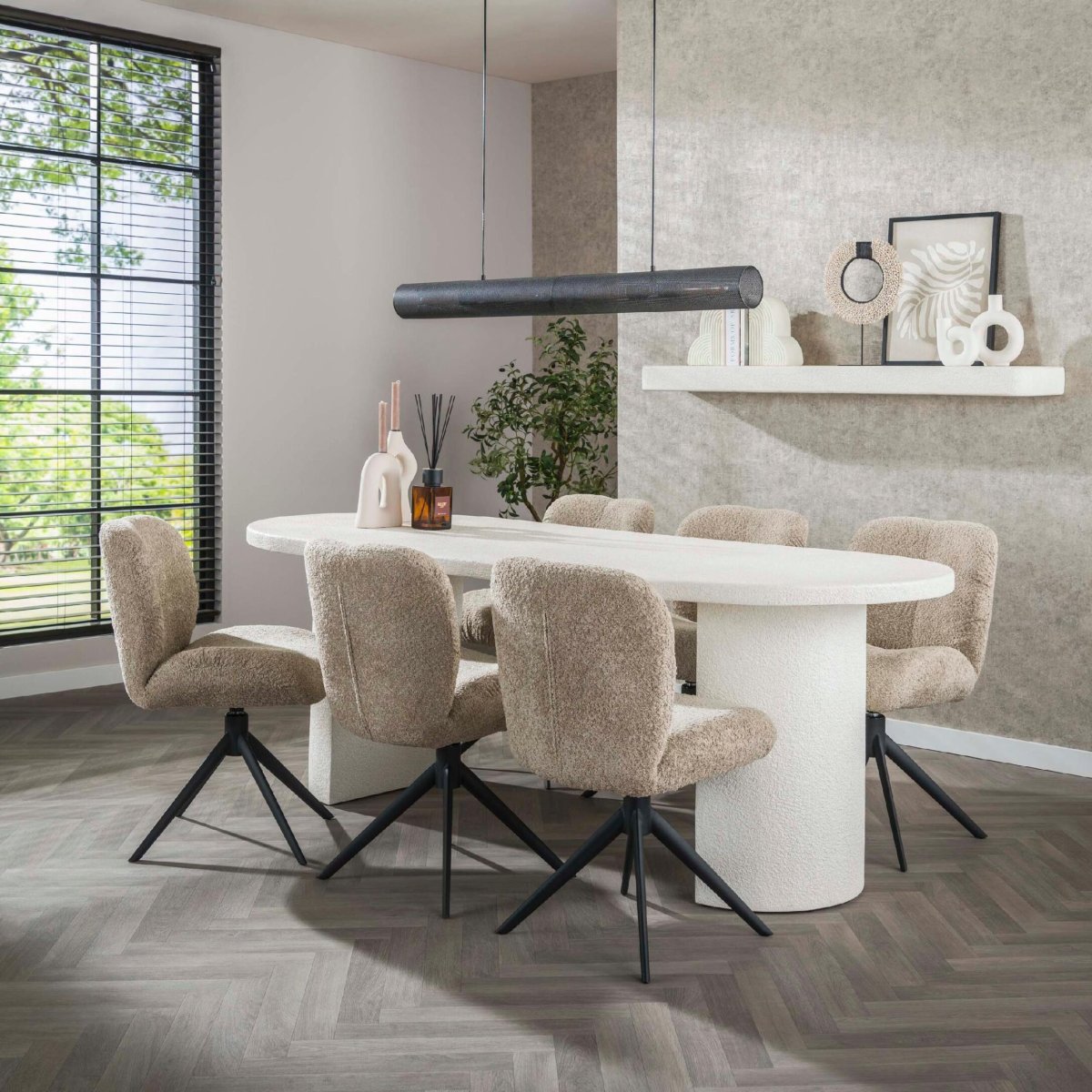 De halve maanvormige kolompoten geven deze ovale eettafel een uitgesproken, architectonische uitstraling. Het krachtige silhouet en de strakke lijnen zorgen voor een luxe, moderne look die de tafel tot een echte eyecatcher in de eetkamer maakt. In een minimalistisch interieur komt het ontwerp prachtig tot zijn recht, maar ook in een meer eclectische of hotel chique woonstijl vormt de tafel een stijlvol middelpunt. Combineer het marmer composiet blad met zachte, stoffen stoelen voor een warm contrast of kies voor leren eetkamerstoelen voor een extra moderne, luxe uitstraling. Door de neutrale kleur en tijdloze vormgeving kun je eindeloos variëren met accessoires zoals kandelaars, servies, bloemen en tafellinnen, zodat je eethoek steeds weer een nieuwe sfeer krijgt. Deze Nest of Nora eettafel is daarmee niet alleen functioneel, maar ook een duurzaam designstuk waar je jarenlang plezier van hebt.