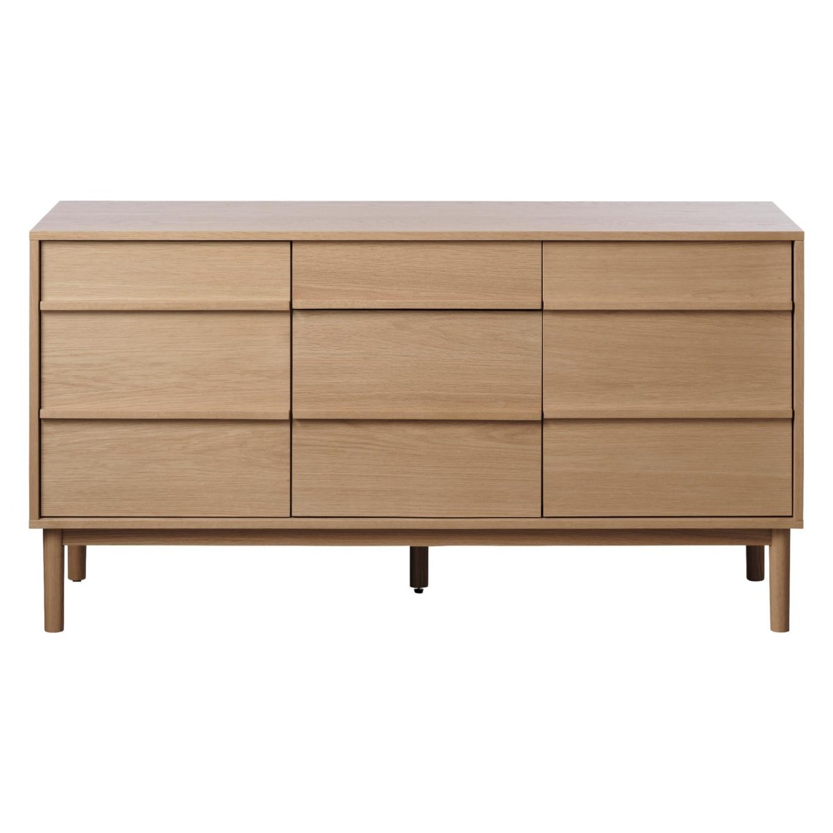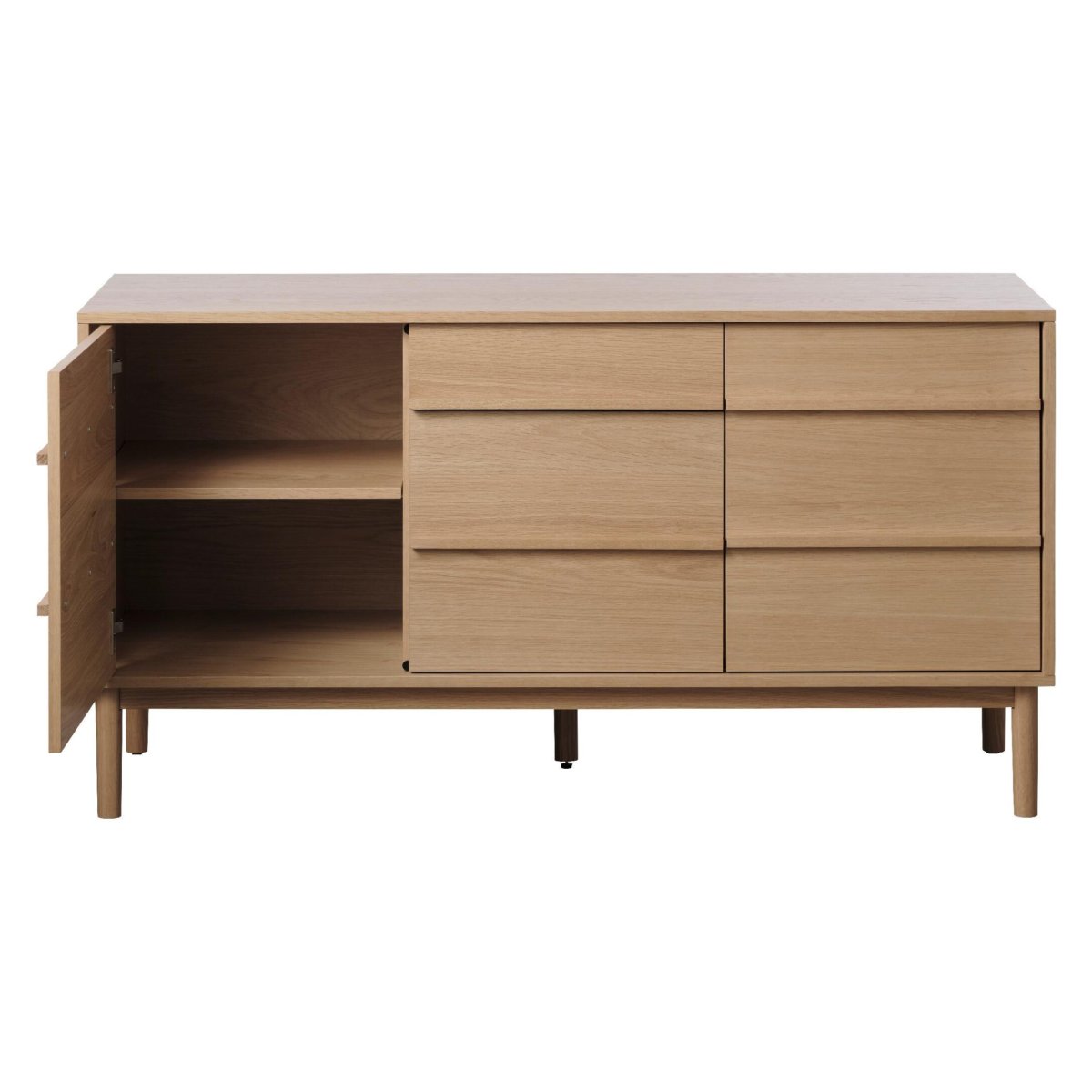Dit natuurlijke dressoir van eikenfineer combineert strak, minimalistisch design met royale, praktische opbergruimte. De lage kast is 140,2 cm breed en afgewerkt in een matte natureltint die naadloos aansluit bij een modern, Scandinavisch of warm, sfeervol interieur. Met 3 deuren, 1 lade en verstelbare legplanken berg je servies, glaswerk, tafellinnen en woonaccessoires netjes uit het zicht. Het slanke houten onderstel zorgt voor een luchtige uitstraling en maakt schoonmaken onder de kast eenvoudig. Ideaal als sideboard in de woonkamer of eetkamer, maar ook stijlvol als opbergmeubel in de hal of slaapkamer. Van Nest of Nora.