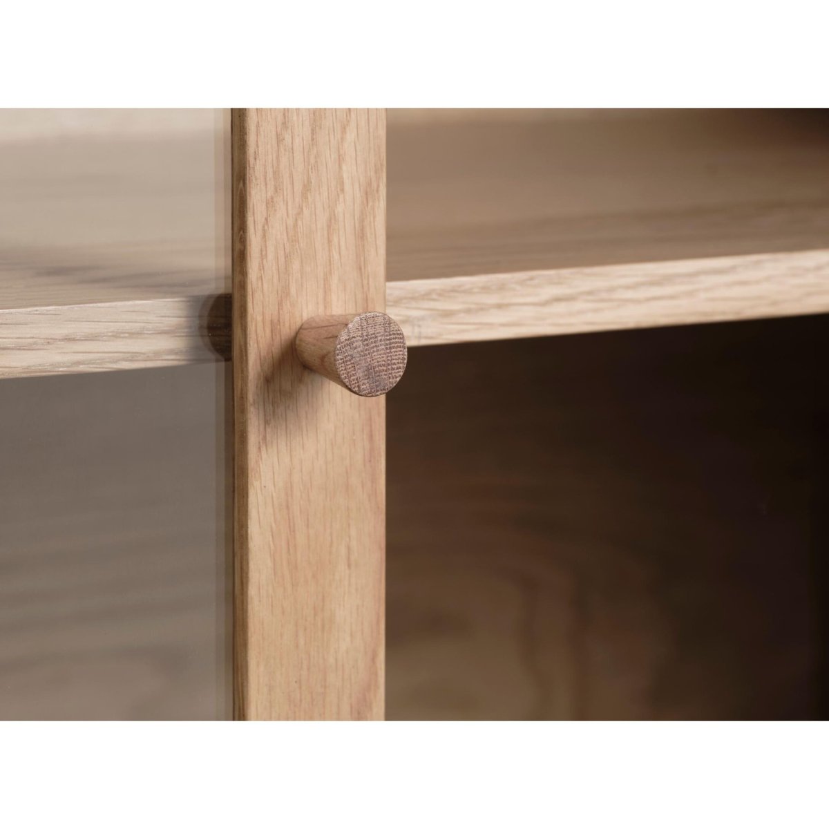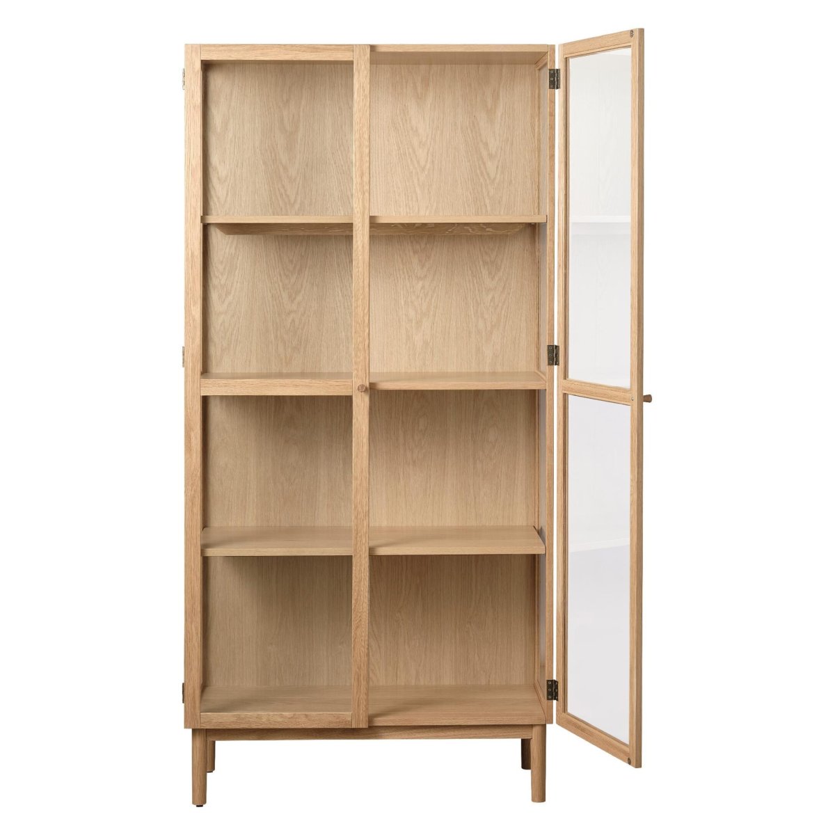 De indeling van deze eiken vitrinekast is ontworpen voor flexibel en dagelijks gebruik. De drie ruime legplanken, waarvan er twee in hoogte verstelbaar zijn, maak je eenvoudig passend voor hoog servies, wijnglazen, karaffen, vazen of stapels boeken. De royale plankbreedte en -diepte bieden voldoende ruimte voor borden, opbergboxen en decoratieve accessoires, terwijl de draagkracht van 10 kg per plank stabiliteit en zekerheid geeft. Zo wissel je moeiteloos tussen pronken en praktisch opbergen. De houten handgrepen liggen prettig in de hand en de glasdeuren zorgen ervoor dat je in één oogopslag ziet wat waar staat. De open zichtlijn door het glas creëert een subtiel etalage-effect, waardoor je favoriete items direct sfeer toevoegen in de woonkamer, keuken of eetkamer.
