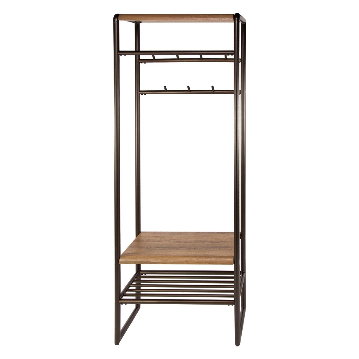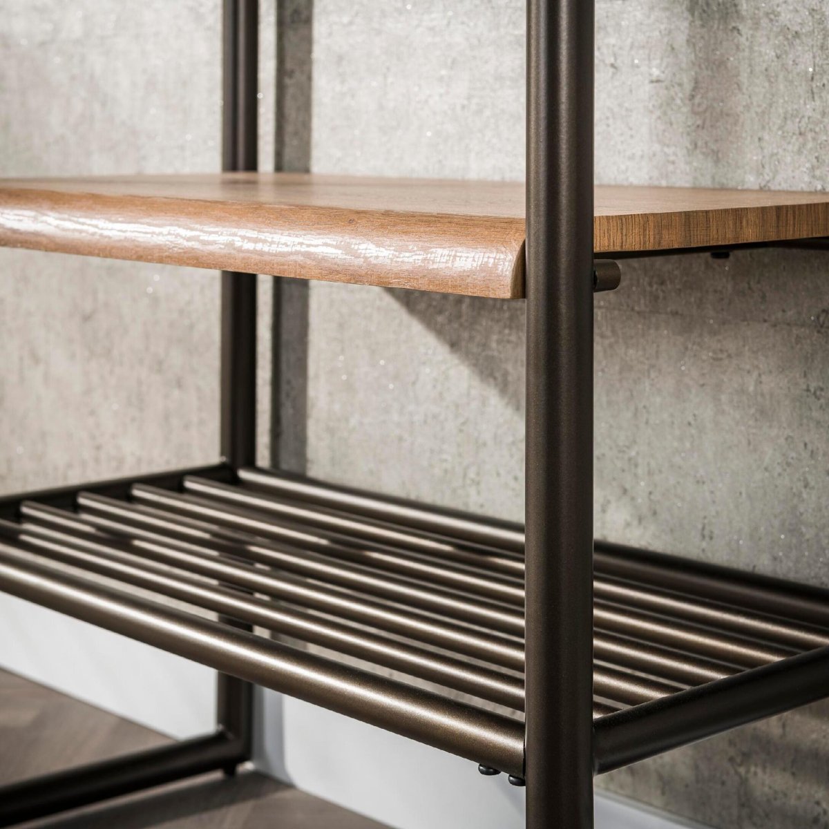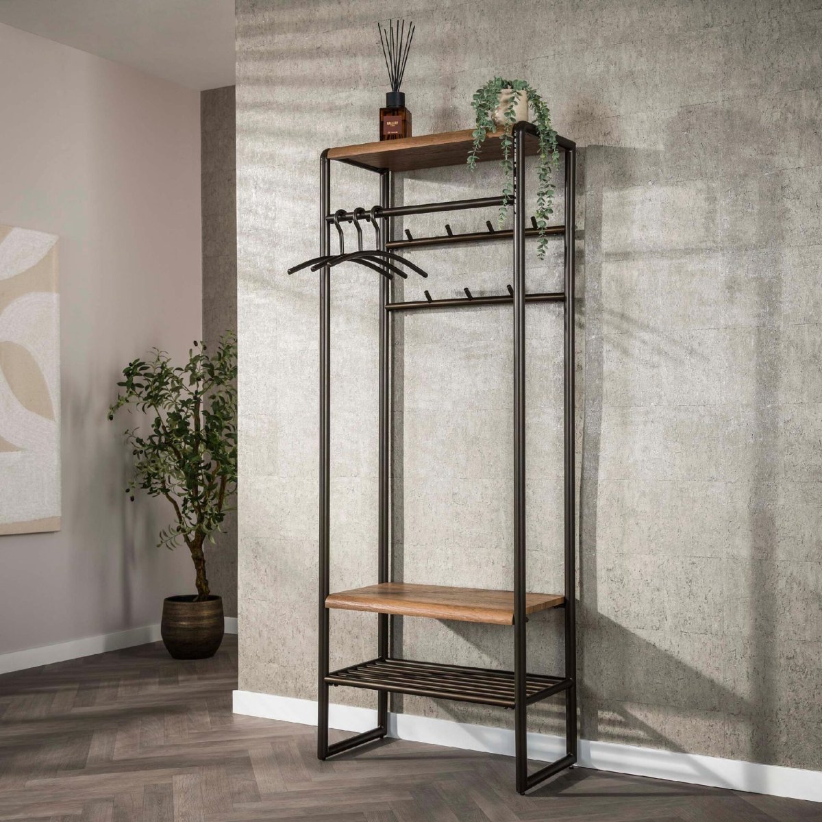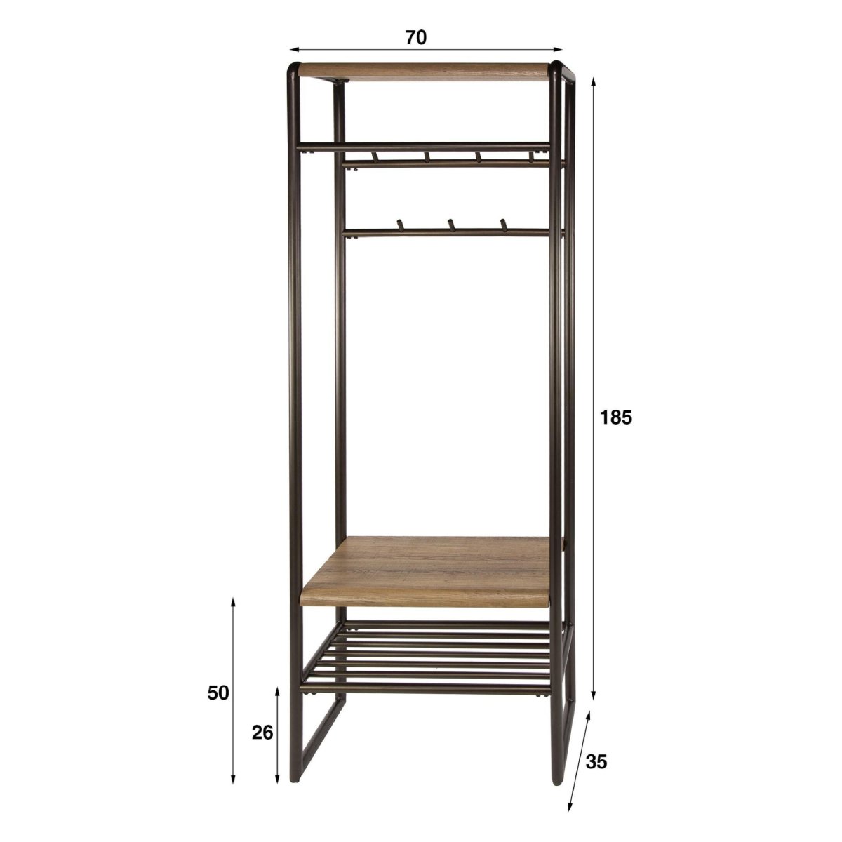 Door het slanke, ruimtebesparende formaat is dit garderobemeubel bijzonder geschikt voor smalle gangen, kleine hallen, studentenkamers en appartementen waar elke centimeter telt. Je hebt in één compact meubel een kapstok, garderobe en schoenenrek, zonder dat de ruimte rommelig of vol oogt. De combinatie van een bronskleurig stalen frame en planken in eikenhoutlook geeft het meubel een tijdloze, stoere uitstraling die past bij uiteenlopende woonstijlen: industrieel, modern, Scandinavisch en zelfs landelijk. Plaats het garderobemeubel bijvoorbeeld naast de voordeur, in de bijkeuken, in de gang of in een logeerkamer als extra kapstok. Zo creëer je eenvoudig een vaste, overzichtelijke plek voor alle jassen en schoenen en raak je minder snel iets kwijt bij het naar buiten gaan.