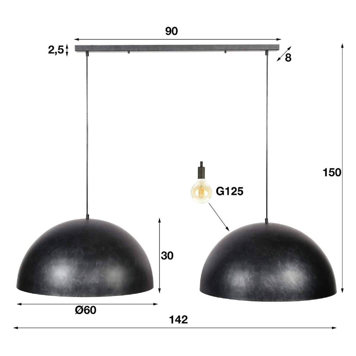 - Fitting: 2x E27, geschikt voor LED lichtbron G125 filament bol Ø12,5