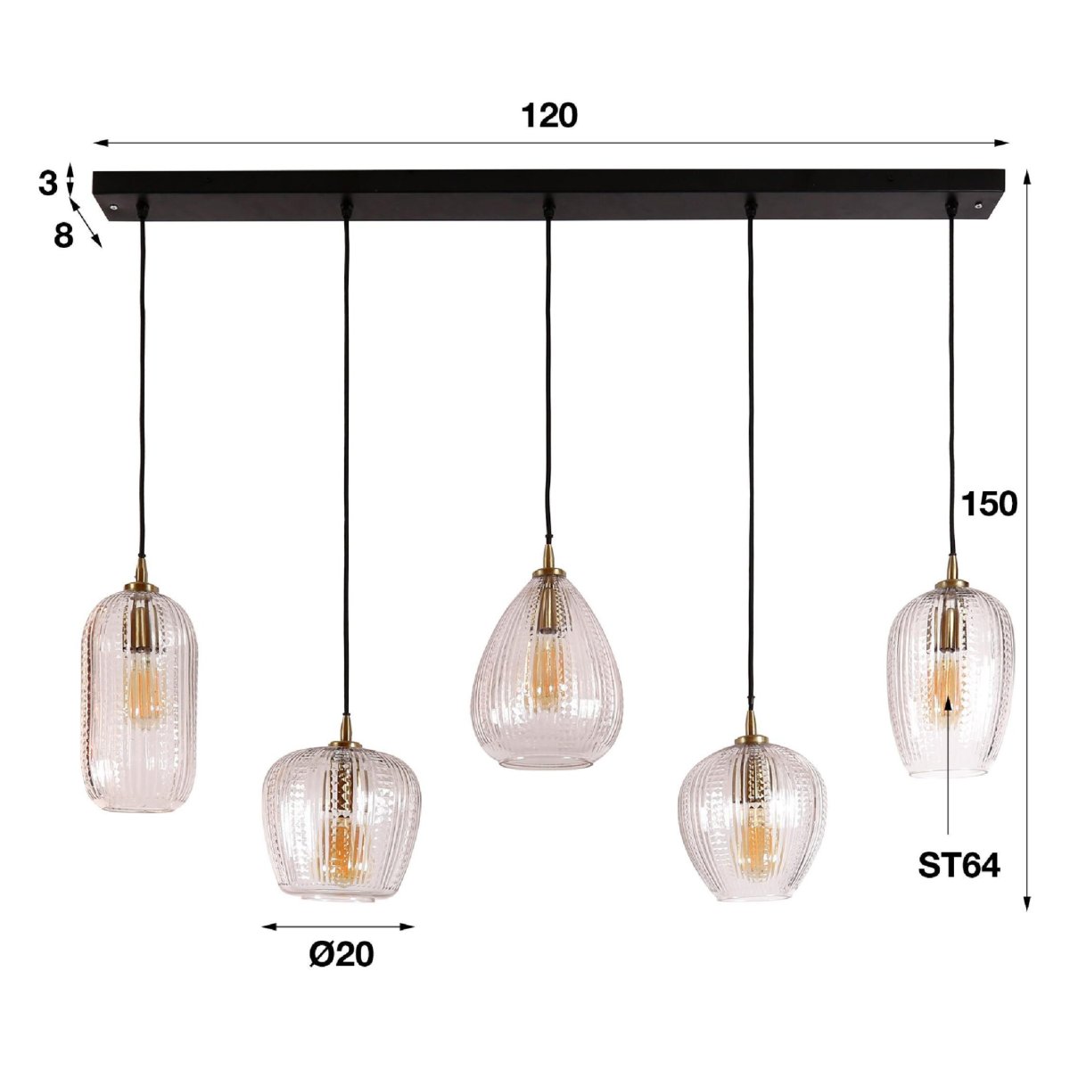 Deze moderne 5-lichts hanglamp voor boven de eettafel combineert strak design met een luxe, sfeervolle uitstraling. De vijf glazen kappen van diamantglas zorgen voor schitterende lichtreflecties en geven je interieur direct een chique upgrade. Elke kap is afzonderlijk in hoogte verstelbaar tot 150 cm, zodat je de lamp perfect kunt afstemmen op jouw eettafel, kookeiland, bar of zithoek. Deze design hanglamp is een echte eyecatcher in een modern, industrieel of hotel chique interieur en komt het beste tot zijn recht met een warme LED filament lichtbron met E27 fitting.