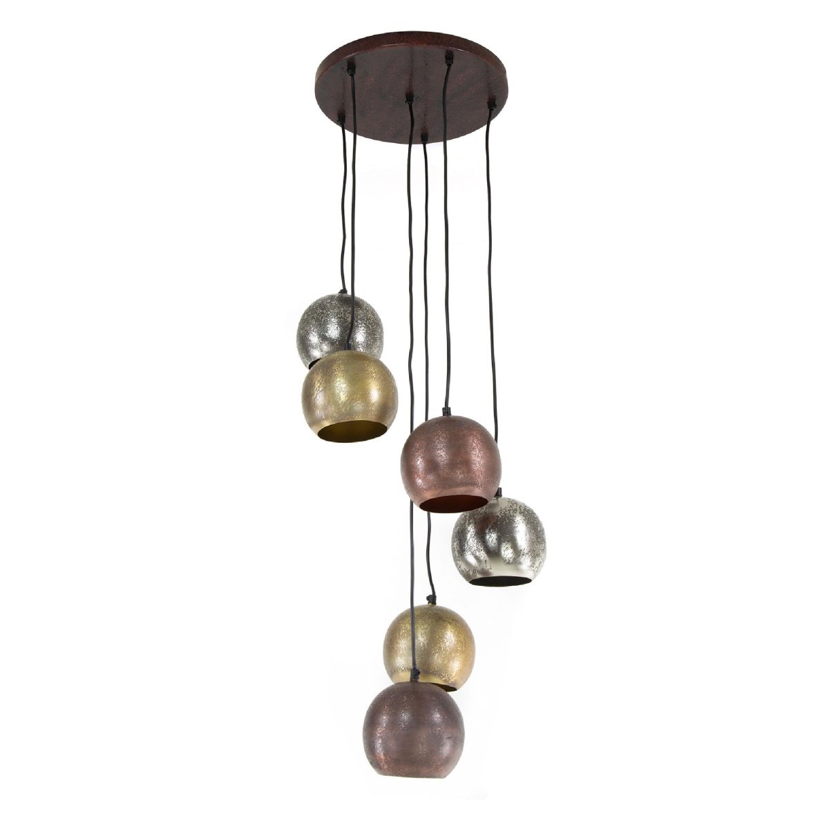 De hanglamp onderscheidt zich door het speelse, getrapte ontwerp met zes hangende bollen, die samen een dynamisch en elegant geheel vormen. Door de mix van mat nikkel met chroom-, goud- en kopertinten ontstaat een luxe uitstraling die uitstekend past in een modern, industrieel, Scandinavisch of hotel chique interieur. De bewerkte metalen kappen geven extra diepte, structuur en karakter, waardoor het licht sfeervol wordt verspreid en de lamp ook overdag een opvallend designobject is. Hang deze hanglamp boven de eettafel voor een warme, gezellige sfeer tijdens het diner, gebruik haar als eyecatcher in de zithoek of positioneer de lamp boven een kookeiland voor een luxe keukenlook. Door de neutrale metallic kleuren combineer je dit model moeiteloos met houten meubels, marmer, beton, zwarte accenten en diverse woonstijlen.