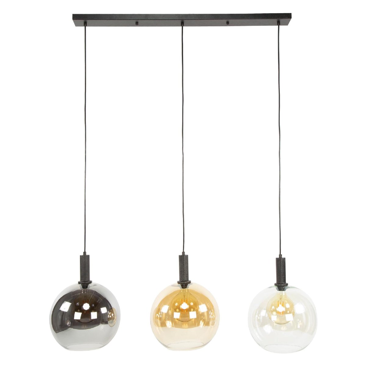 Deze bolvormige 3-lichts hanglamp is ontworpen als echte eyecatcher in je interieur. De drie glazen bollen in chroom, amber en transparant glas vormen samen een dynamisch en luxe geheel, zeker in combinatie met decoratieve LED filament lichtbronnen. Zo creëer je een warme, uitnodigende gloed – ideaal boven de eettafel, in de zithoek of in de hal. De artic zwarte plafondplaat en het strakke metalen armatuur geven de hanglamp een modern en tijdloos karakter, waardoor hij perfect past in een industrieel, modern of hotel chique interieur.