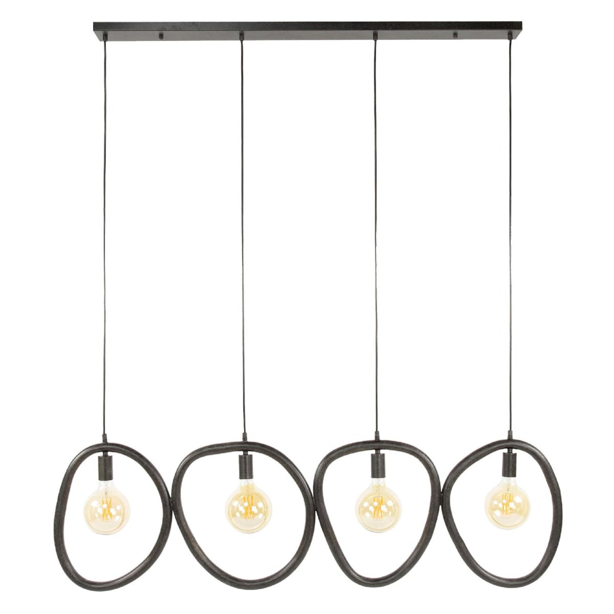 Deze moderne hanglamp met vier lichtpunten in artic zwart is de ideale eyecatcher boven je eettafel, kookeiland of bartafel. De metalen lamp heeft een strak, minimalistisch design, aangevuld met organisch gevormde details rondom elke lichtbron. Dankzij de in hoogte verstelbare pendels pas je de lamp moeiteloos aan jouw interieur, plafondhoogte en woonruimte aan. De ronde plafondplaat en de nette afwerking zorgen voor een tijdloze uitstraling die naadloos aansluit bij een modern, industrieel én Scandinavisch interieur. Combineer de hanglamp met dimbare LED filament lichtbronnen voor zowel functioneel licht als warme, sfeervolle verlichting in huis.