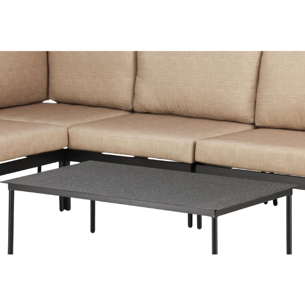 De slimme hoekopstelling creëert een ruime zithoek met een ultiem loungegevoel, perfect om samen te genieten met familie en vrienden. De diepe zit en de 11 zachte, goed gevulde kussens ondersteunen comfortabel loungen tijdens lange zomeravonden of relaxte weekendmomenten. Het ontwerp blijft rustig en hoogwaardig: het zwarte stalen frame geeft de buitenbank een modern silhouet, terwijl de beige bekleding direct warmte en sfeer toevoegt. Zo ontstaat een luxe hoek loungeset die past in zowel een strakke, moderne tuin als een mediterrane of landelijke buitenruimte. De lage loungetafel maakt het geheel compleet en zorgt voor een gezellige, toegankelijke setting waarin je hapjes, tijdschriften of een serveerplank met drankjes altijd binnen handbereik hebt.
