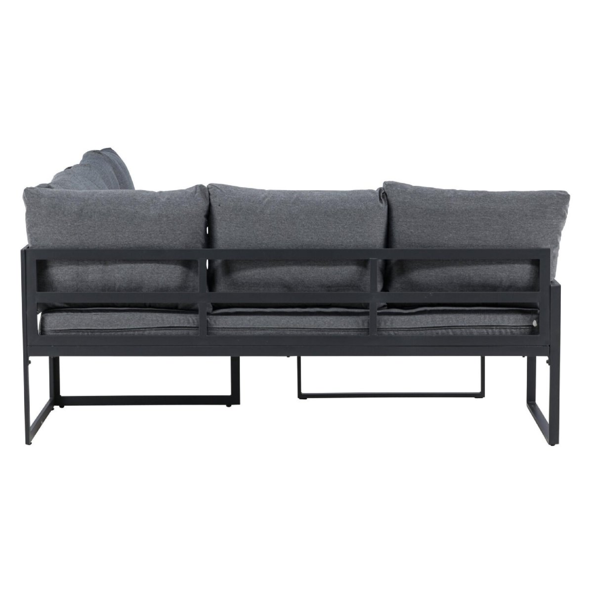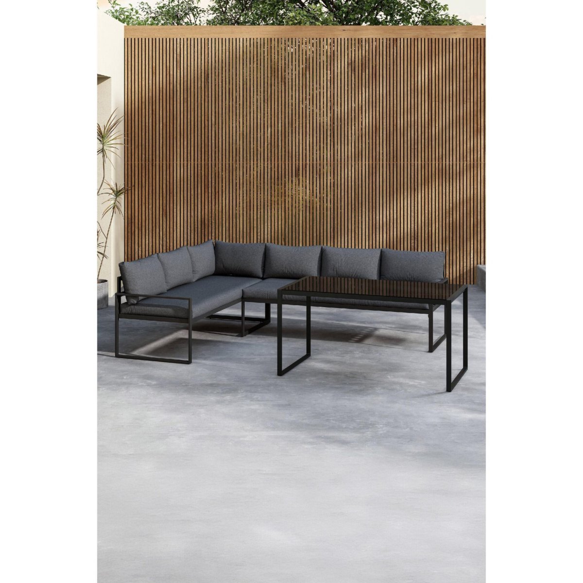 Deze stijlvolle hoek loungeset voor de tuin combineert een strak modern design met slimme, praktische details. De zwarte loungetafel met gehard glazen blad en het duurzame stalen frame geven je terras, veranda of balkon direct een luxe, eigentijdse uitstraling. De royale L‑vormige buitenbank met comfortabele grijze kussens biedt volop zitruimte om te loungen, borrelen of buiten te eten – van relaxed koffiemoment tot gezellige zomeravond met vrienden. Dankzij het minimalistische silhouet past deze loungeset perfect in een moderne tuin, maar ook in een kleinere of knusse buitenruimte.