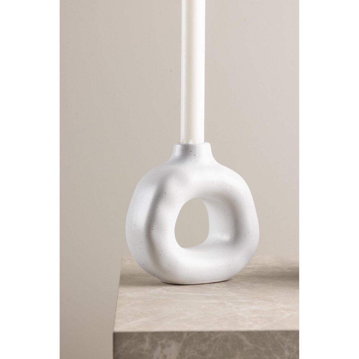 Deze ronde kaarsenstandaard is eenvoudig te stylen in vrijwel iedere ruimte in huis. Plaats hem op de eettafel voor intiem kaarslicht tijdens diners, op de salontafel voor extra sfeer tijdens film- of leesavonden, of op de vensterbank als subtiel stylingaccent overdag. Door het compacte formaat komt de kandelaar ook goed tot zijn recht in kleinere hoekjes, op een nachtkastje of in een open wandrek. De grafische stippen zorgen voor speelsheid in een rustig interieur, terwijl de witte basis juist balans brengt in een drukkere setting. Varieer met kaarskleuren per seizoen of trend: bijvoorbeeld warme nude- en crèmetinten in de winter, zacht zand- en grijstonen in de lente, of diepere aardetinten in de herfst. Zo blijft je interieur moeiteloos up-to-date, zonder grote aanpassingen – één kandelaar, eindeloos veel stylingopties.