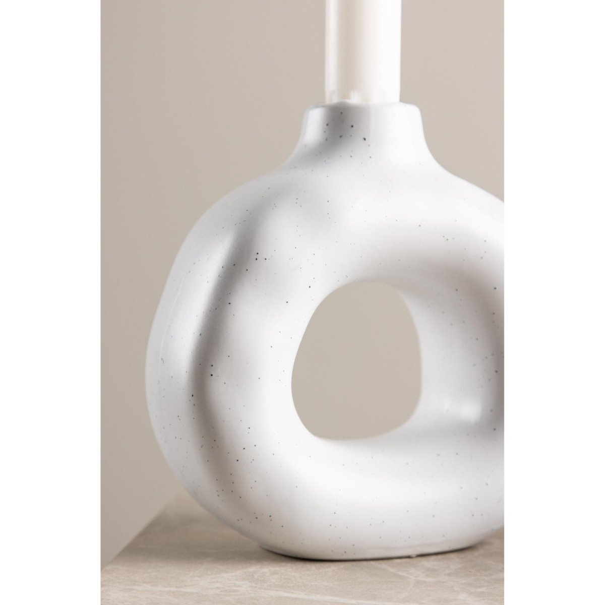 Deze design kandelaar in wit steengoed met zwarte stippen is een stijlvolle blikvanger met een grafische, maar toch rustige uitstraling. De speelse stippen geven karakter en dynamiek, zonder te overheersen, waardoor de kaarsenhouder perfect past in uiteenlopende woonstijlen zoals modern, Scandinavisch, boho chic of Japandi. De ronde vorm zorgt voor een zachte, uitnodigende look, terwijl de hoogte van 13 cm voldoende opvalt op een gedekte tafel, dressoir of open kast. Gebruik de kandelaar solo als minimalistisch statement piece, of combineer met andere kandelaars, vazen en woonaccessoires voor een gelaagde, persoonlijke styling. Dankzij de neutrale basis in wit kun je gemakkelijk variëren met materialen als hout, glas, textiel en metaal en creëer je in een paar seconden een gezellige sfeer met kaarslicht.