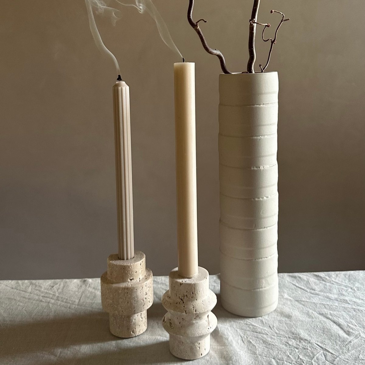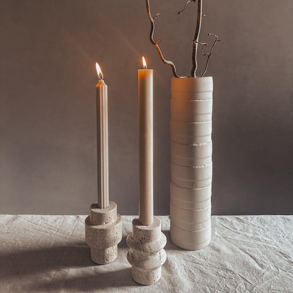 De eenvoudige cilindervorm en het compacte ronde formaat maken deze travertin kaarsenhouder extreem veelzijdig in gebruik. Op de eettafel is hij perfect als onderdeel van een natuurlijk centerpiece met een schaal, linnen tafelloper en een vaas met droogbloemen. Op de vensterbank style je de kandelaar met glaswerk en keramiek voor speelse hoogteverschillen en materiaalcombinaties. Op een nachtkastje of sidetable zorgt het warme natuursteen direct voor een uitnodigende, hotel chique ambiance. Dankzij de neutrale natural kleur combineert de kandelaar moeiteloos met koele én warme tinten, van wit en beige tot grijs, terracotta en donker hout. De strakke, geometrische vorm leent zich bovendien uitstekend om te groeperen: plaats twee of drie kandelaars in verschillende hoogtes, materialen of tinten bij elkaar voor een modern, grafisch effect met zacht kaarslicht.