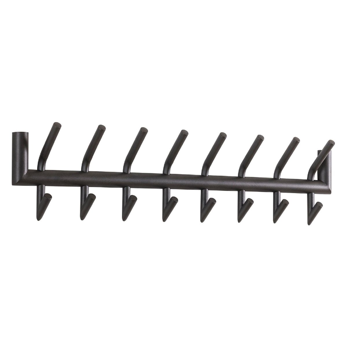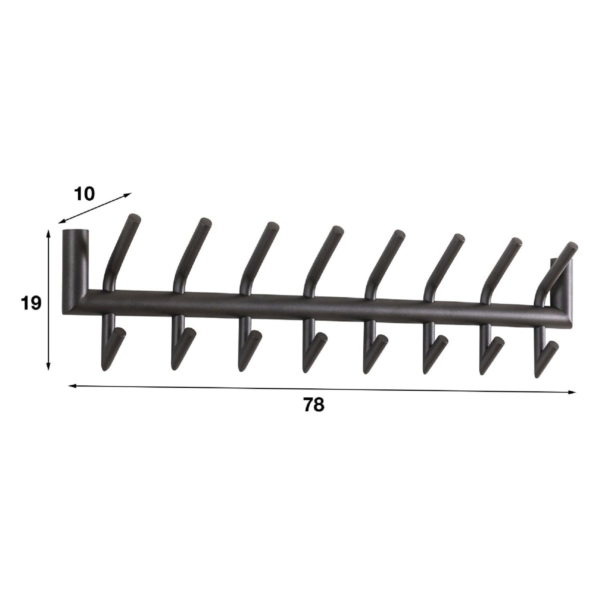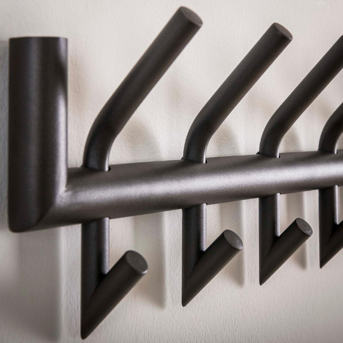 Deze wandkapstok is volledig uitgevoerd in hoogwaardig staal en afgewerkt met een duurzame poedercoating in mat donkergrijs. Hierdoor is de kapstok uitstekend bestand tegen intensief dagelijks gebruik in een druk huishouden of kantooromgeving. De krasbestendige coating beschermt het oppervlak, waardoor de kapstok langer mooi blijft en eenvoudig schoon te maken is met een droge of licht vochtige doek. De matte afwerking voelt prettig aan bij het ophangen en afnemen van jassen en tassen en versterkt de moderne, industriële look. Dankzij het robuuste materiaal en de solide constructie geniet je jarenlang van deze praktische wandkapstok en combineer je duurzaamheid, design en gebruiksgemak in één compact wandmodel.