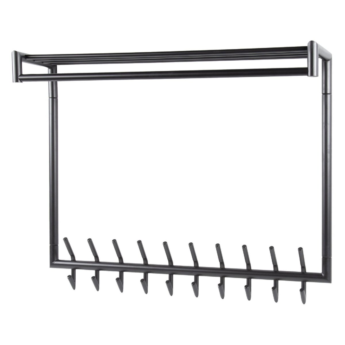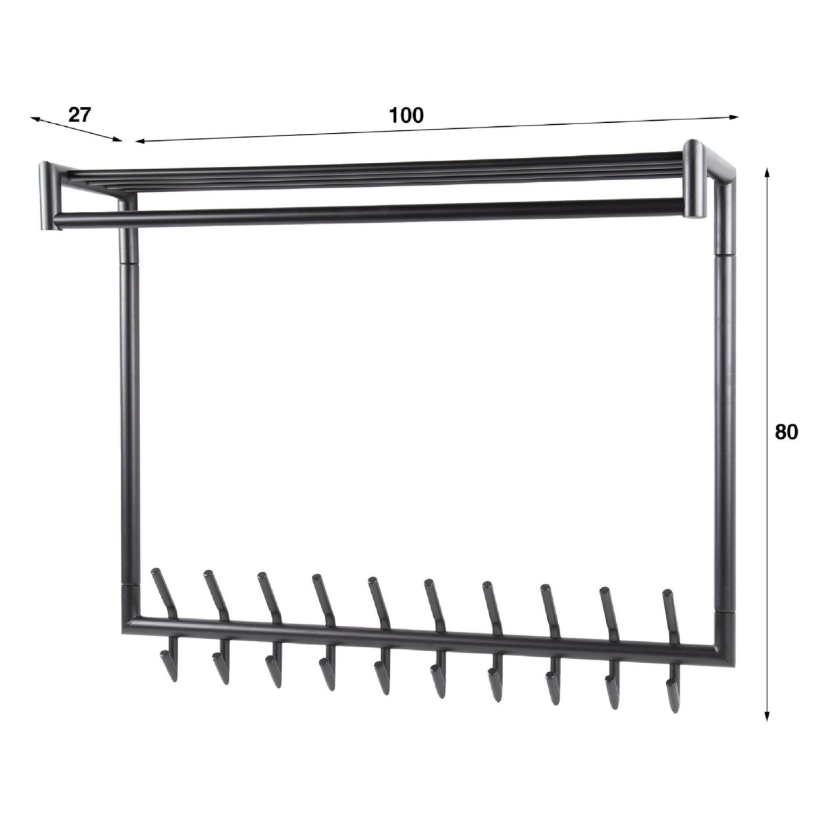 Deze stoere wandkapstok met hoedenplank en roede is de ideale, ruimtebesparende oplossing voor iedere hal, gang of entree. Door de royale breedte, maar liefst twintig haken, een stevige roede en een open hoedenplank biedt deze kapstok volop opbergruimte voor jassen, tassen, sjaals en hoofddeksels. Het mat donkergrijze design van gepoedercoat staal geeft je interieur direct een industrieel karakter, terwijl de open constructie zorgt voor een lichte, ruime uitstraling. Zo combineer je met deze wandkapstok praktische, overzichtelijke opbergruimte met een strakke, moderne look die perfect past in zowel een minimalistische als industriële inrichting.