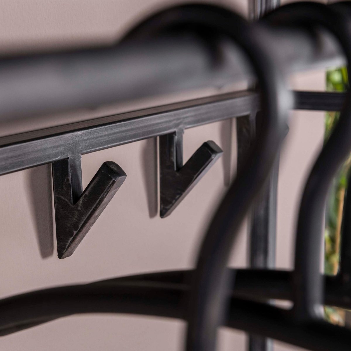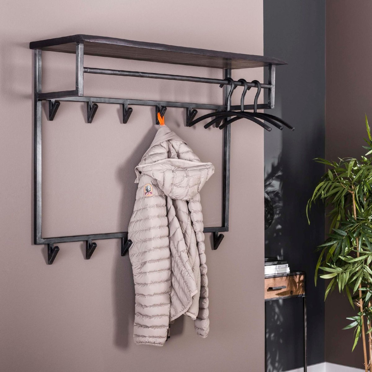 Doordat deze kapstok aan de muur hangt, houd je de vloer vrij voor bijvoorbeeld een schoenenrek, schoenenkast of bankje. Dit zorgt voor een rustig en ruimtelijk effect in de hal. De combinatie van zwart hout en metaal geeft de kapstok een tijdloze uitstraling die uitstekend te combineren is met andere zwarte woonaccessoires, metalen lampen, industriële spiegels en meubels met houten bladen. Zo creëer je snel een samenhangende, stijlvolle en praktische entree.
