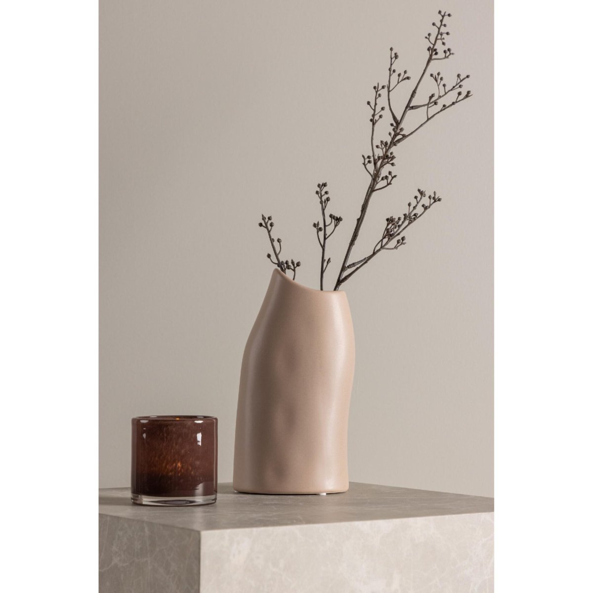 Of je nu kiest voor tulpen, veldbloemen, rozen, eucalyptus, pampasgras of een moderne mix van droogbloemen: de opening en verhoudingen van deze lichtroze vaas geven je alle ruimte om creatief te stylen. Zet de vaas solo neer voor een rustige, moderne look, of combineer haar met andere vazen in verschillende hoogtes en kleuren voor een speels, gelaagd geheel. Op een vensterbank weerkaatst de lichtroze tint mooi met het daglicht; op een sidetable vormt de vaas een zacht kleuraccent tussen boeken, kaarsen en kunstobjecten. Wissel per seizoen van kleurpalet—zachte pastels in het voorjaar, frisse groenen in de zomer, warme aardetinten in de herfst en winter—en je interieur oogt telkens nieuw, persoonlijk en stijlvol. Met deze lichtroze keramische vaas van Nest of Nora voeg je eenvoudig een tijdloze, elegante en veelzijdige woonaccessoire toe aan je interieur.