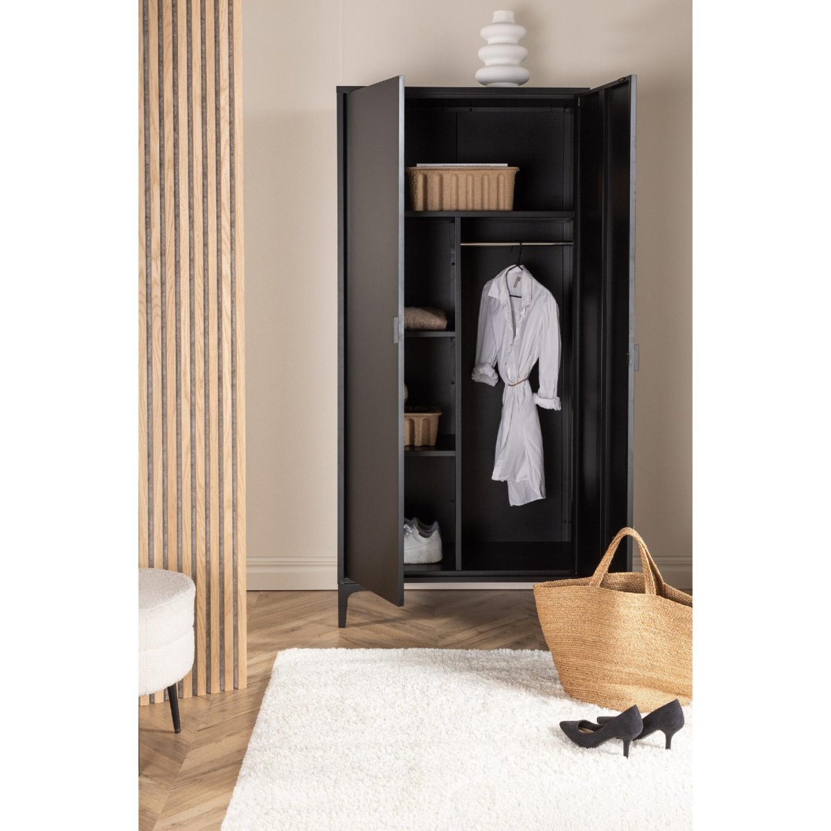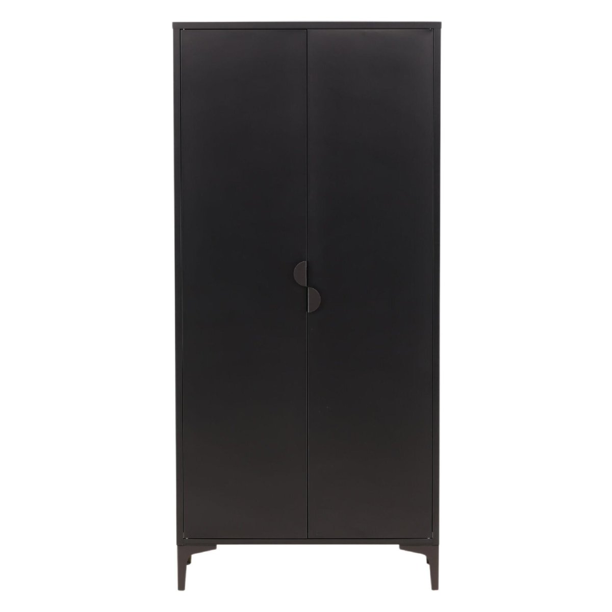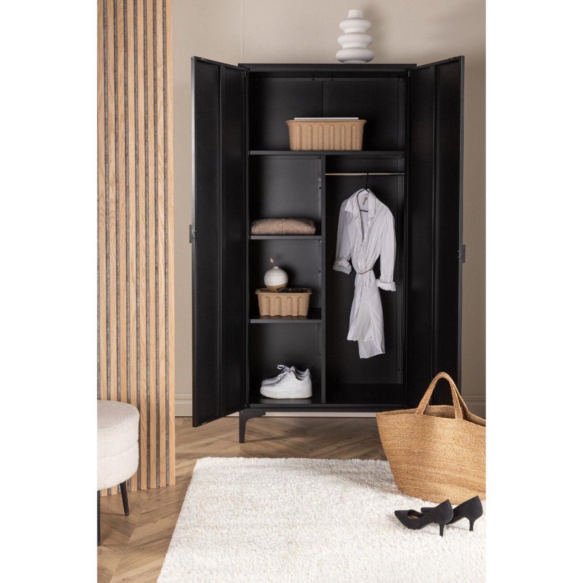 Deze 2-deurs kledingkast van zwart staal is een moderne, tijdloze garderobekast met royale opbergruimte. Achter de deuren vind je een ruim hanggedeelte voor jassen, jurken, overhemden en blouses, aangevuld met meerdere legplanken voor truien, broeken, t-shirts en beddengoed. Het slanke, verhoogde onderstel geeft de kast een luchtige uitstraling en maakt stofzuigen en dweilen onder de kast eenvoudig. Dankzij het sterke stalen frame is dit een duurzame, stabiele slaapkamerkast met een industriële look, perfect als kledingkast, opbergkast of garderobe in de hal, logeerkamer, studentenkamer of walk-in closet.