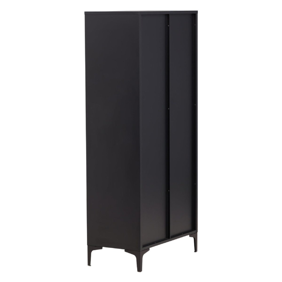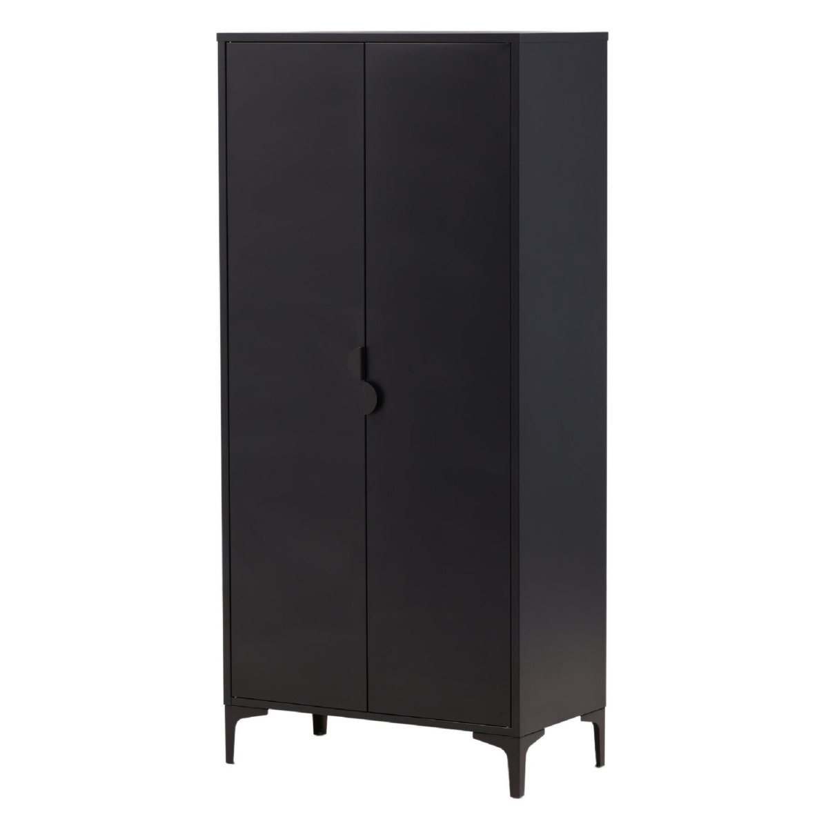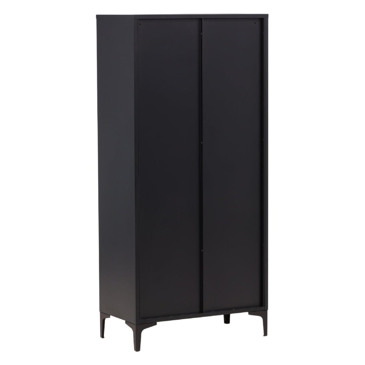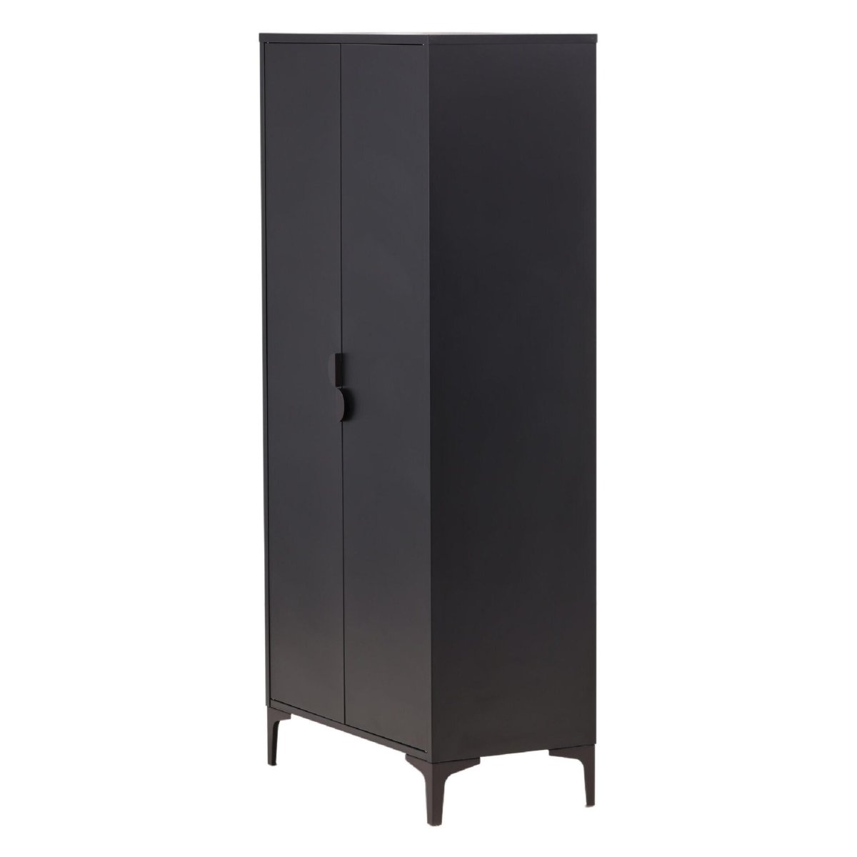 Deze 2-deurs kledingkast van zwart staal is een moderne, tijdloze garderobekast met royale opbergruimte. Achter de deuren vind je een ruim hanggedeelte voor jassen, jurken, overhemden en blouses, aangevuld met meerdere legplanken voor truien, broeken, t-shirts en beddengoed. Het slanke, verhoogde onderstel geeft de kast een luchtige uitstraling en maakt stofzuigen en dweilen onder de kast eenvoudig. Dankzij het sterke stalen frame is dit een duurzame, stabiele slaapkamerkast met een industriële look, perfect als kledingkast, opbergkast of garderobe in de hal, logeerkamer, studentenkamer of walk-in closet.