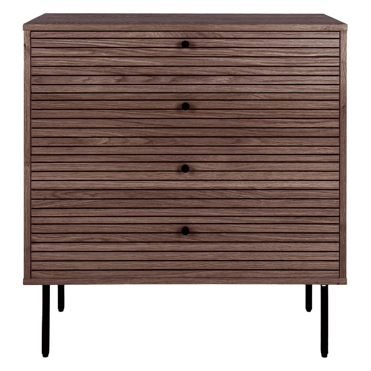 Het MDF met eikenfineer biedt de natuurlijke uitstraling van echt hout, maar dan met de voordelen van een stabiele, vormvaste basis. Het fineer voelt warm en authentiek aan en is geschikt voor dagelijks gebruik in drukke huishoudens. De stalen poten zorgen voor extra stevigheid en een duurzame constructie, zodat de kast geschikt is voor diverse ruimtes in huis, zoals slaapkamer, woonkamer, hal of werkkamer. Qua onderhoud is deze ladekast bijzonder gebruiksvriendelijk: regelmatig afstoffen met een zachte, droge doek is voldoende, en gemorste druppels kun je beter direct verwijderen met een licht vochtige doek. Zo blijft de afwerking mooi, blijft de houtstructuur zichtbaar en behoudt de kast lang zijn luxe uitstraling. Dankzij de neutrale donkergrijze tint, het warme houtbeeld en de strakke vormgeving combineer je deze Nest of Nora Enna ladekast eenvoudig met andere meubelstukken, kleuren en woonstijlen – een duurzame en stijlvolle investering in een opgeruimd interieur.