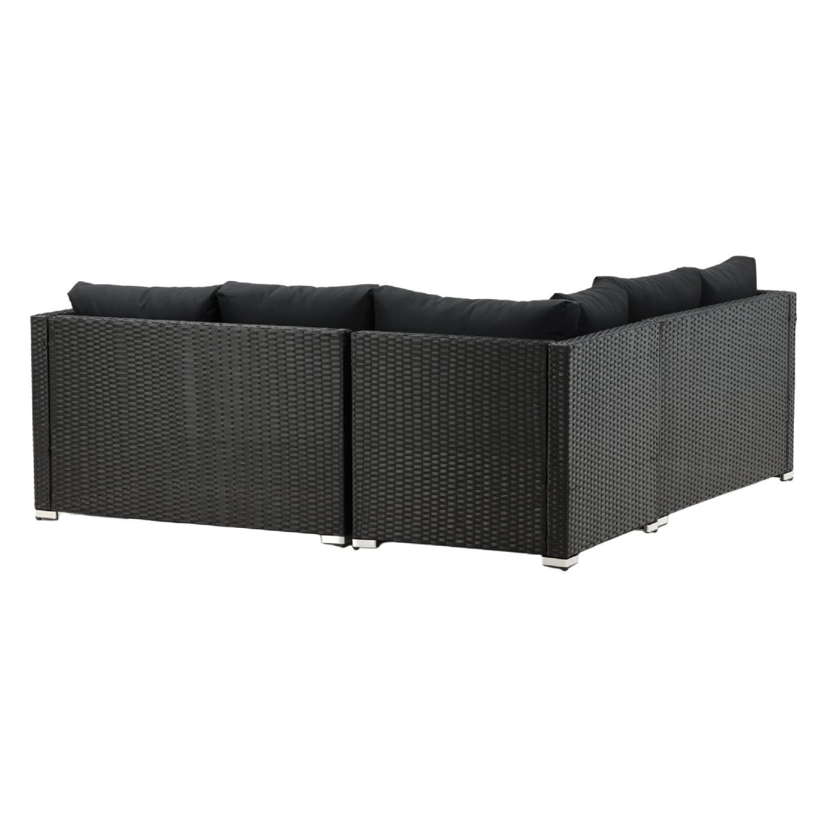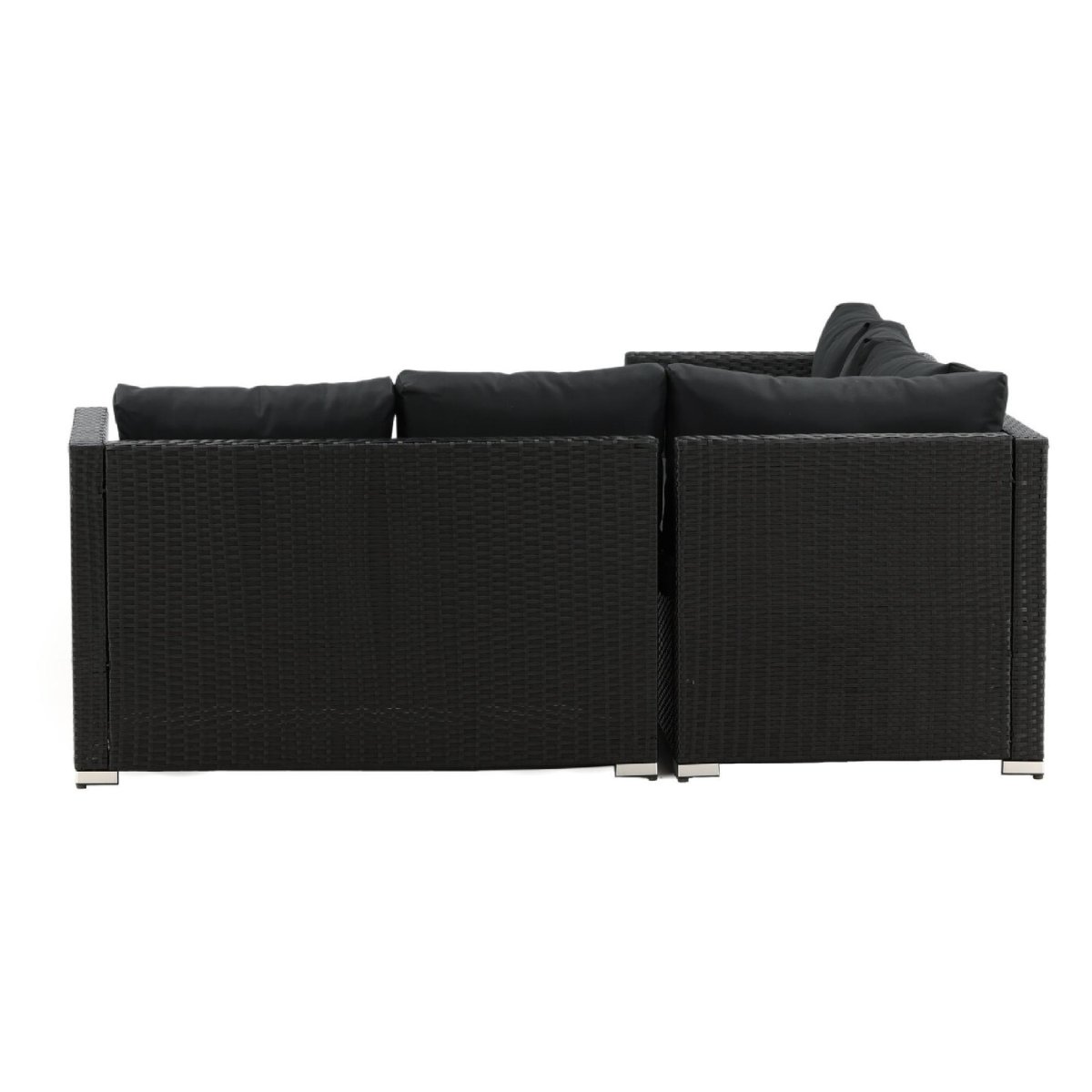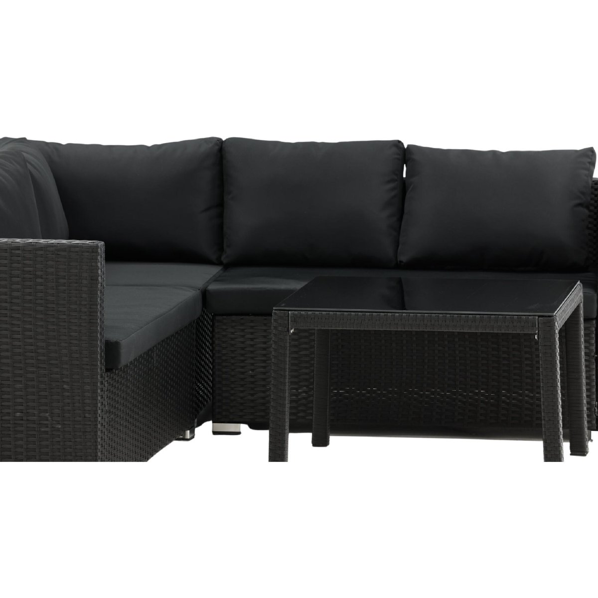 Deze eigentijdse loungeset met hoekbank en tafel geeft je terras, tuin of balkon in één keer een moderne, luxe uitstraling. Het onderhoudsarme kunstrotan in diepzwart is volledig weerbestendig en UV-bestendig, waardoor de set seizoen na seizoen mooi blijft. De lage loungetafel met zwart glazen blad maakt de stijlvolle look compleet. Dankzij de modulaire hoekopstelling stem je de set eenvoudig af op jouw buitenruimte, met comfortabele zitplaatsen en zachte kussens voor lange, ontspannen zomeravonden. Het lichte maar stevige frame maakt verplaatsen eenvoudig, zodat je snel een gezellige loungehoek creëert. Ideaal als compacte tuinset of balkonset om relaxed te loungen, te borrelen of te genieten van koffie in de buitenlucht.