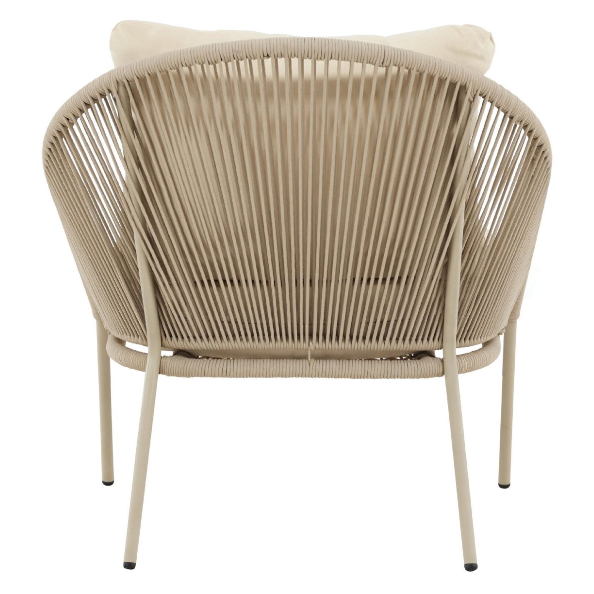 Het sterke stalen frame vormt de solide basis van deze loungestoel en zorgt voor stabiliteit, een hoog draagvermogen en langdurig gebruik, ook buiten. Het gevlochten touw rondom de rugleuning geeft de stoel een luxe, ambachtelijke uitstraling, voegt textuur toe en biedt lichte flexibiliteit voor extra zitgemak. De gebruikte stof is slijtvast en geschikt voor dagelijks gebruik, ideaal als tuinstoel of balkonstoel die je regelmatig buiten plaatst. Door de neutrale, aardse beige kleur combineer je de stoel moeiteloos met tuintafels, buitentapijten, kussens en accessoires in zowel natuurlijke tinten als contrasterende kleuren. Het resultaat is een tijdloze loungestoel die perfect past bij moderne, Scandinavische en minimalistische buitenruimtes.