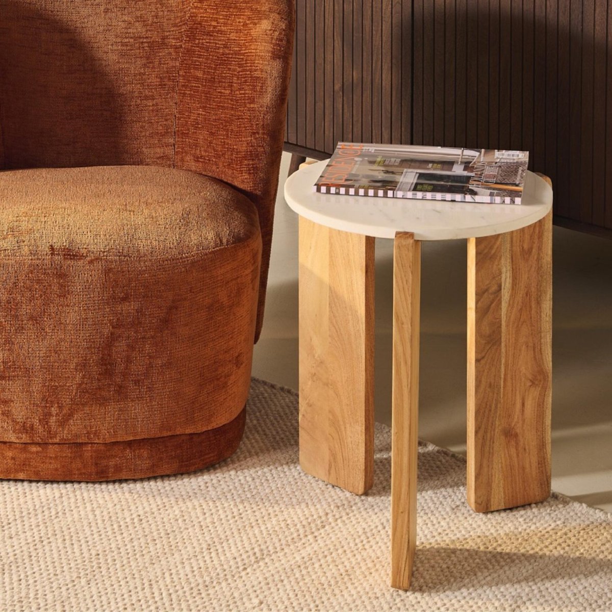 Het massief houten onderstel van acaciahout zorgt voor stabiliteit én voegt warmte toe aan je interieur. Acaciahout is een sterke hardhoutsoort met een rijke nerfstructuur, waardoor deze ronde bijzettafel een ambachtelijke, natuurlijke look krijgt. De lichtbruine kleur sluit prachtig aan bij neutrale tinten, aardse kleuren en zachte materialen zoals wol, bouclé en linnen. Daardoor combineer je dit tafeltje net zo goed met een strakke designbank als met een cosy fauteuil of hotel chique interieur. De stevige houten poten dragen het marmeren blad solide, zodat je zonder zorgen planten, boeken, een dienblad of decoratie plaatst. Zo ontstaat een tijdloze mix van luxe marmer en warm hout in één compact meubelstuk dat jarenlang meegaat.
