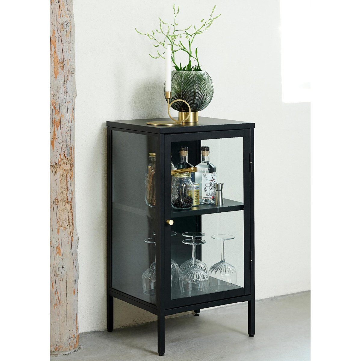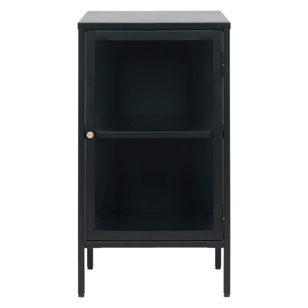 Dit compacte metalen dressoir met glazen deur biedt een perfect evenwicht tussen strak industrieel design en slimme opbergruimte. De matzwarte kast staat stevig op vier metalen poten, heeft een goudkleurige metalen handgreep en een front van gehard glas voor een lichte, open uitstraling. Binnenin creëert het verstelbare legbord twee overzichtelijke vakken, ideaal voor servies, boeken, flessen of decoratieve woonaccessoires. Dankzij het rechthoekige, slanke ontwerp past dit zwarte sideboard moeiteloos in kleinere ruimtes zoals gang, woonkamer, slaapkamer of thuiskantoor. Zoek je een zwarte opbergkast, compact vitrinekastje of modern dressoir van duurzaam metaal? Dit meubelstuk combineert stijl, stabiliteit en dagelijks gebruiksgemak in één functionele blikvanger.