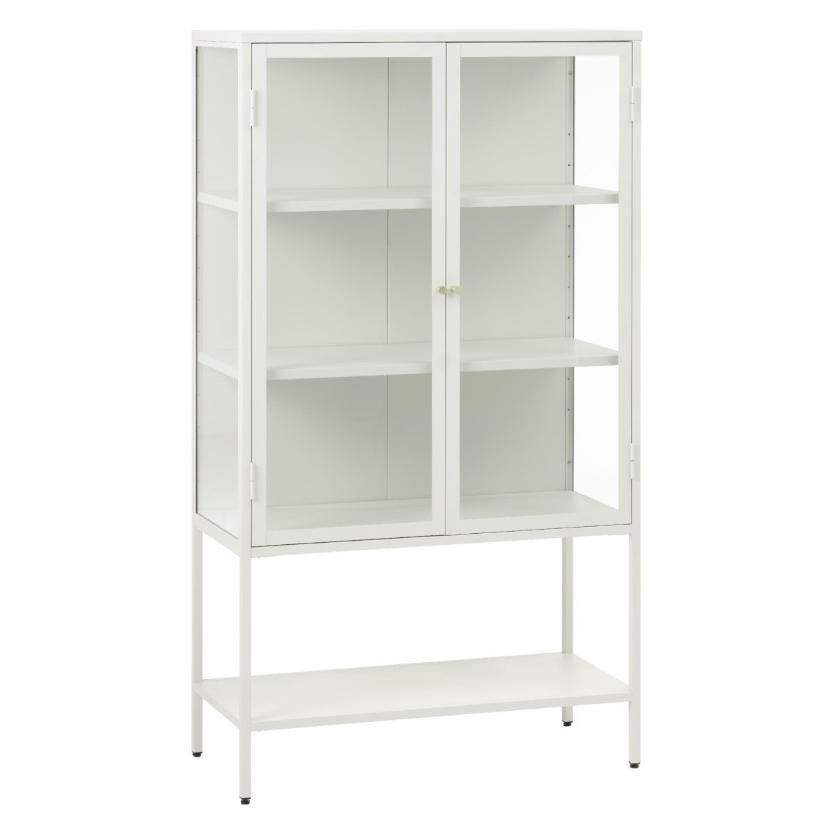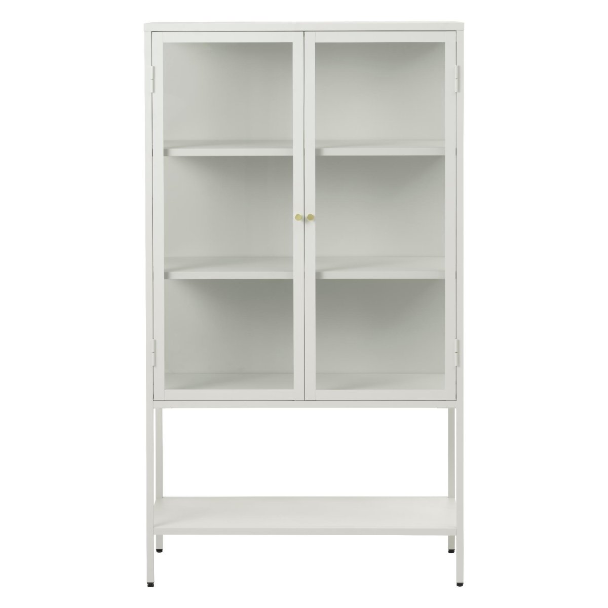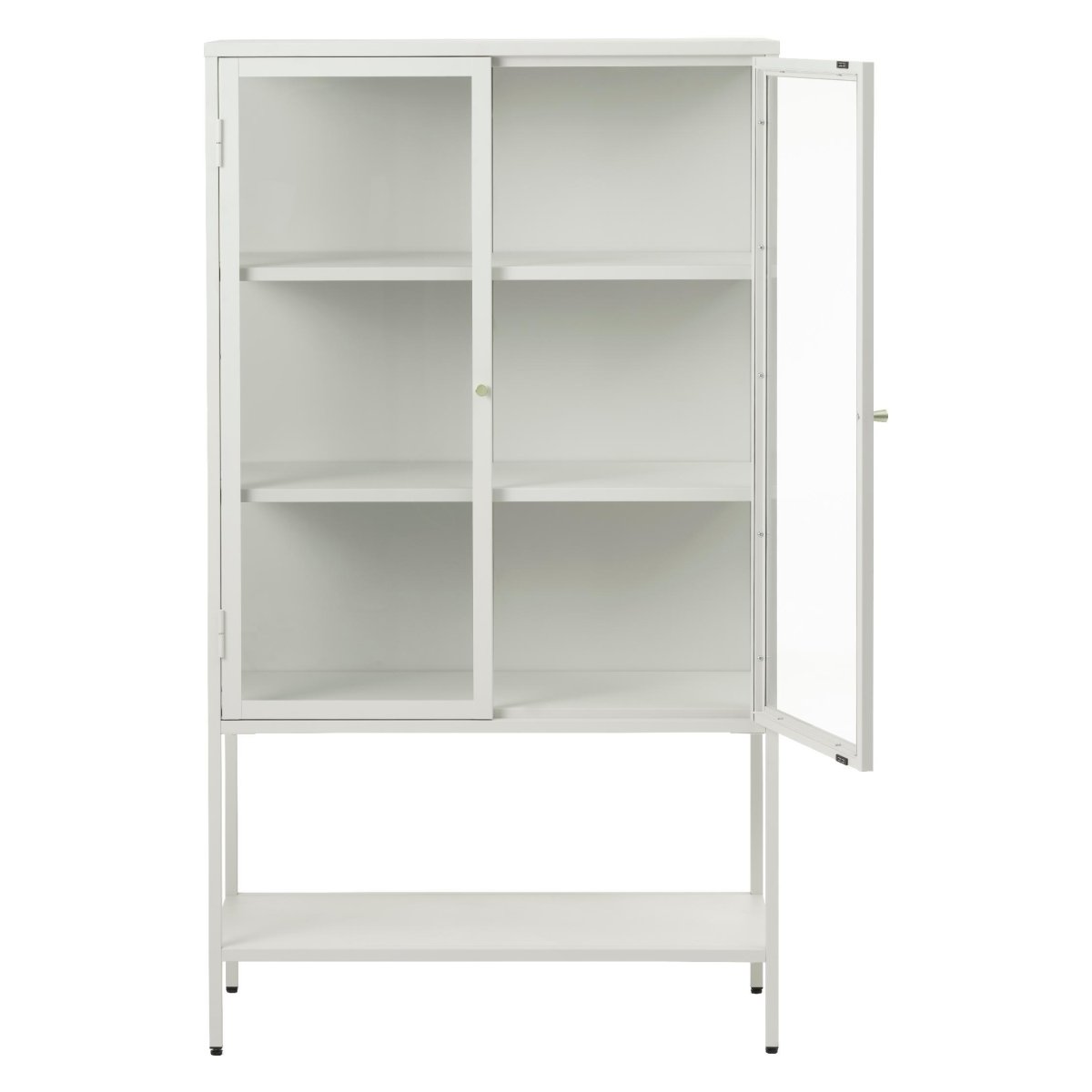 De deuren zijn uitgevoerd in gehard glas voor extra veiligheid, duurzaamheid en een hoogwaardige uitstraling. De volledig metalen constructie zorgt voor een stabiele, solide kast die zonder probleem zwaardere items zoals stapels borden, kommen of boeken kan dragen. Dankzij de witte poedercoating is de vitrinekast eenvoudig schoon te houden: een zachte, licht vochtige doek volstaat om stof en vlekken te verwijderen. Vingerafdrukken en vuil hechten minder snel, waardoor de kast zijn frisse, moderne look behoudt. Kwalitatieve scharnieren zorgen ervoor dat de glazen deuren soepel openen en sluiten, terwijl je favoriete items beschermd blijven tegen stof en toch mooi tentoongesteld staan.