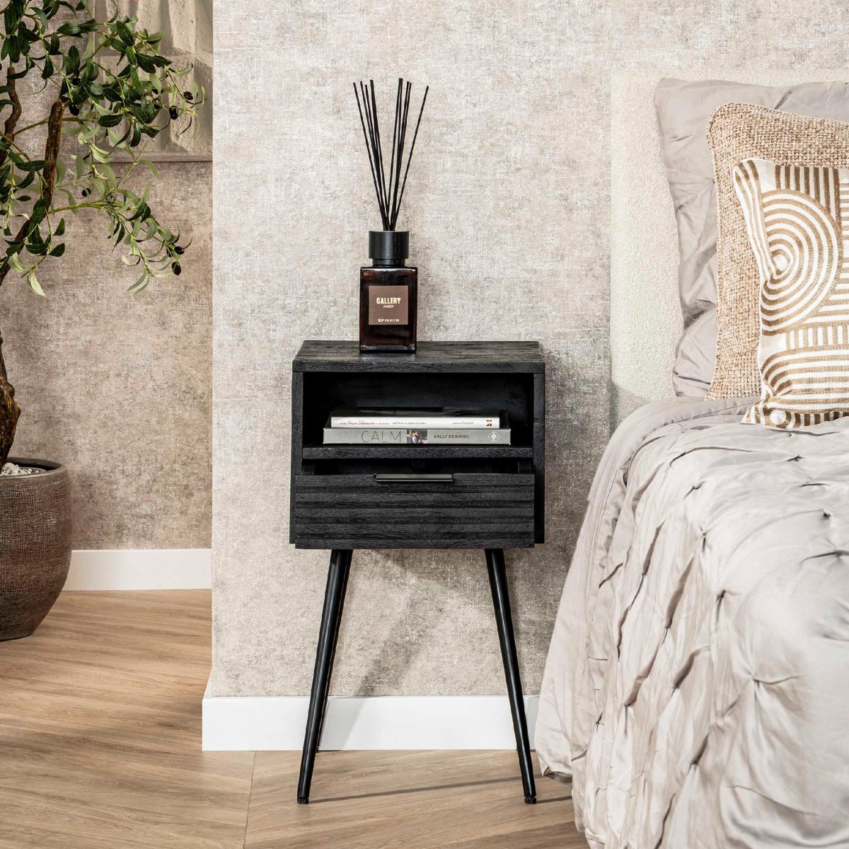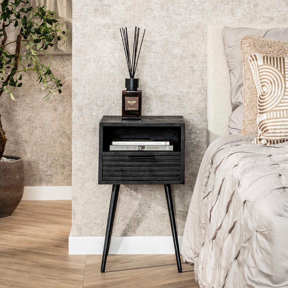 Het slanke, zwarte metalen onderstel geeft dit nachtkastje een moderne, luchtige uitstraling en versterkt het industriële karakter van het ontwerp. De rechte lijnen en minimalistische vormgeving zorgen voor een rustig beeld, waardoor het kastje perfect past in een modern, industrieel, minimalistisch of hotel chique interieur. Doordat het nachtkastje iets van de vloer staat, oogt je slaapkamer ruimtelijker en kun je gemakkelijk onder het meubel stofzuigen of dweilen. Dit is ideaal wanneer je waarde hecht aan een schone, verzorgde slaapkamer. Het compacte formaat maakt dit nachtkastje bovendien zeer geschikt voor kleinere ruimtes, zoals een studio, logeerkamer of studentenkamer, waar je wél praktische opbergruimte wilt, maar weinig vloeroppervlak beschikbaar hebt. Combineer dit zwarte mangohouten nachtkastje met andere zwarte accenten, zoals lampen, lijsten of een bedframe, en je creëert eenvoudig een harmonieus, stijlvol geheel zonder dat de ruimte druk aanvoelt.