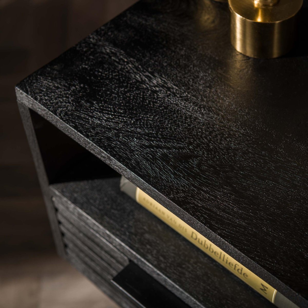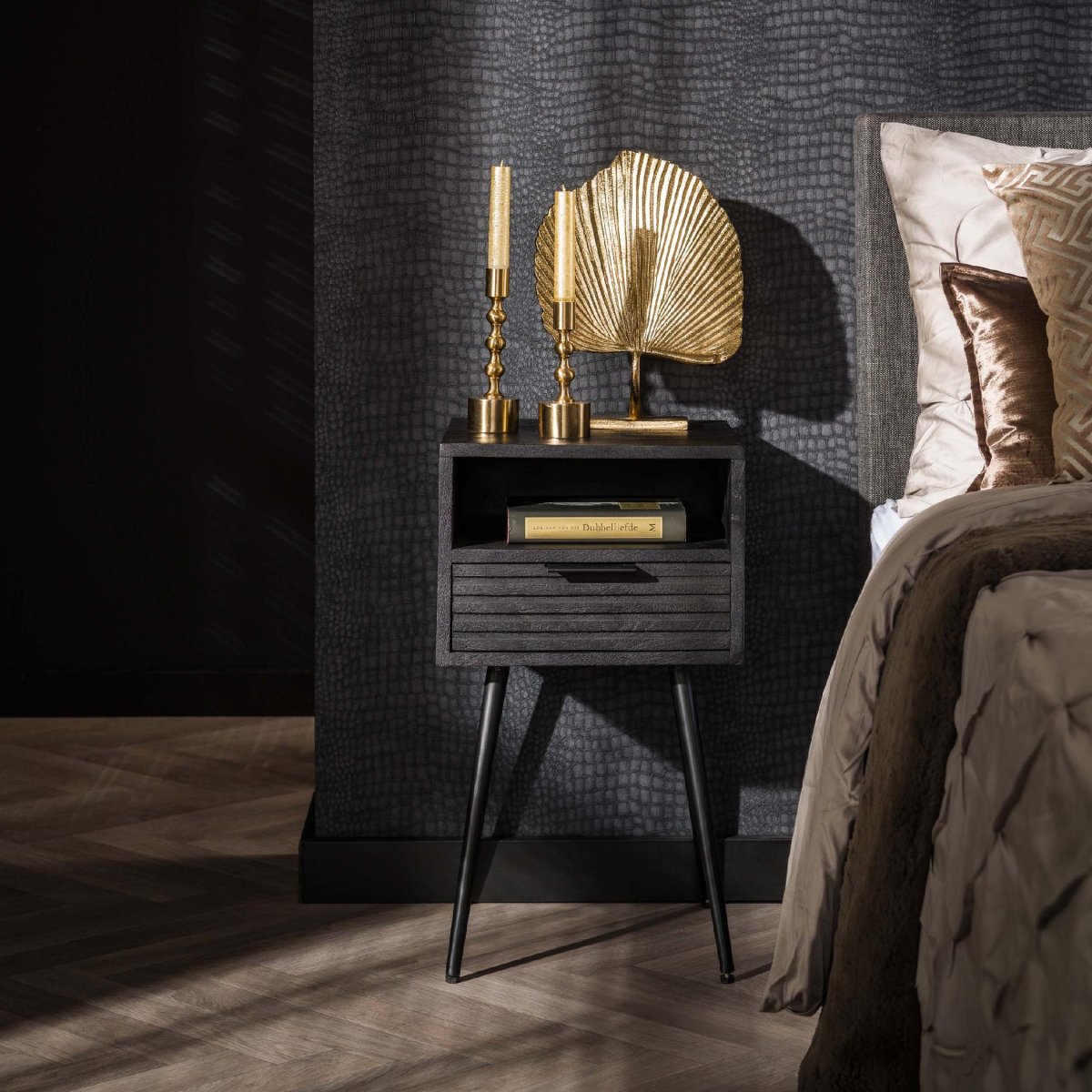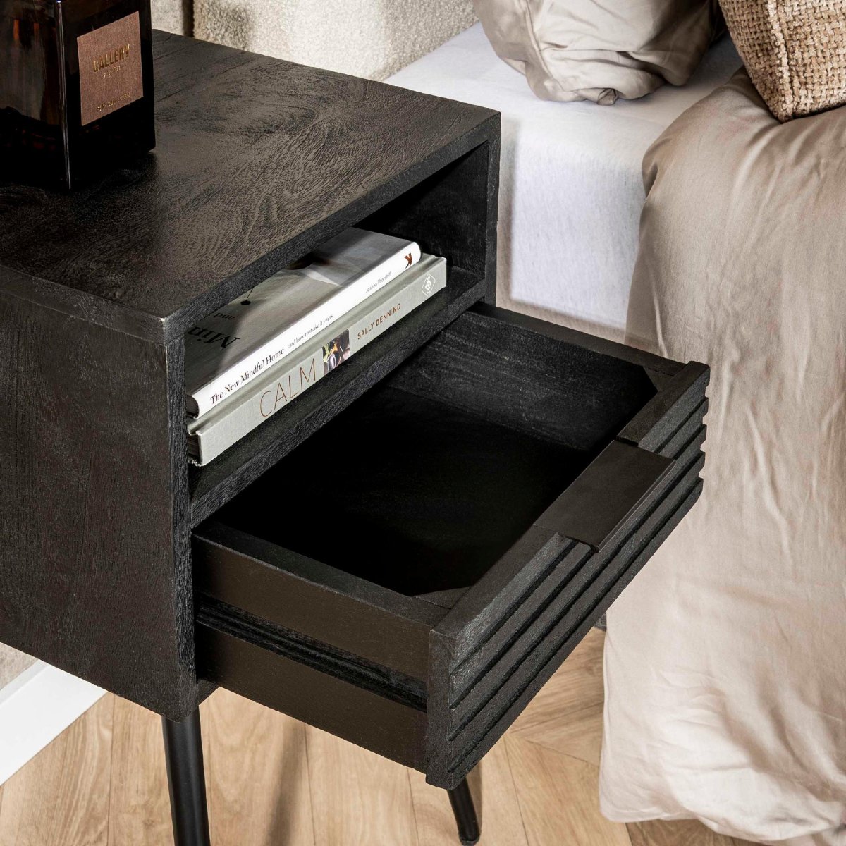 Dit luxe nachtkastje van massief zwart mangohout brengt een tijdloze, stijlvolle uitstraling samen met slimme opbergruimte. Dankzij het compacte design past het moeiteloos naast elk bed en komt het prachtig tot zijn recht in een moderne, industriële of hotel chique slaapkamer. Het nachtkastje beschikt over een praktische lade én een open vak, zodat je boeken, bril, oplader, afstandsbediening en andere slaapkameraccessoires netjes kunt organiseren. De strakke zwarte metalen poten geven het meubel een minimalistische, eigentijdse look, terwijl de zichtbare houtnerf van het mangohout voor warmte, diepte en karakter in je interieur zorgt. Met dit nachtkastje haal je niet alleen een functioneel meubelstuk in huis, maar ook een decoratieve eyecatcher die direct meer sfeer, comfort en stijl toevoegt aan je slaapkamer.