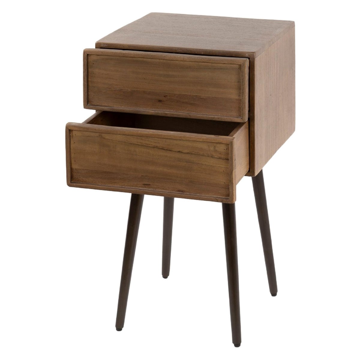 Dit nachtkastje van massief acaciahout is een luxe, stijlvolle én praktische blikvanger voor je slaapkamer. De warme bruine houtkleur, het stevige metalen onderstel in bronstint en de twee ruime lades zorgen voor een perfecte mix van design en gebruiksgemak. Dankzij de compacte afmetingen past dit nachtkastje moeiteloos naast elk bed, terwijl de natuurlijke houtstructuur een sfeervolle, hotel-chique uitstraling geeft. Door de combinatie van hout en metaal komt dit nachtkastje prachtig tot zijn recht in een modern, industrieel of landelijk interieur en biedt het voldoende opbergruimte voor al je nachtkast essentials, zoals boeken, bril, telefoon, opladers en verzorgingsproducten.