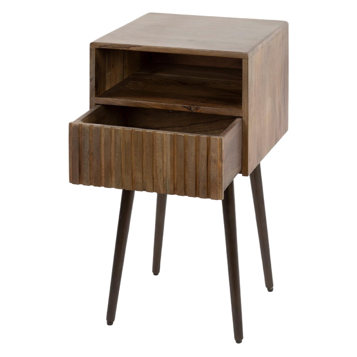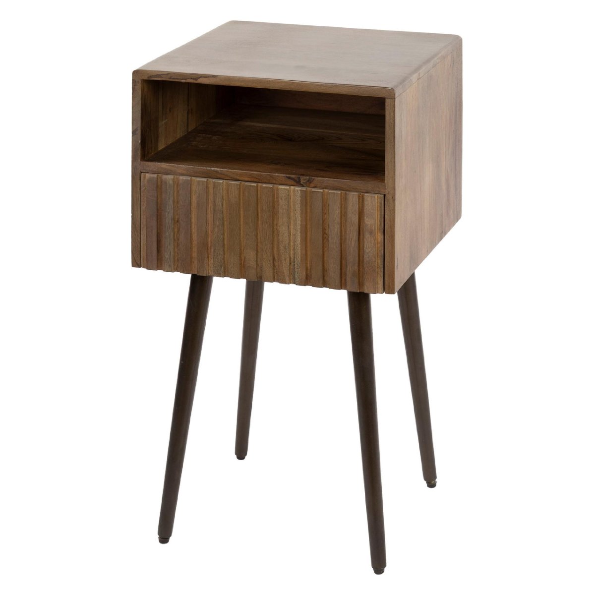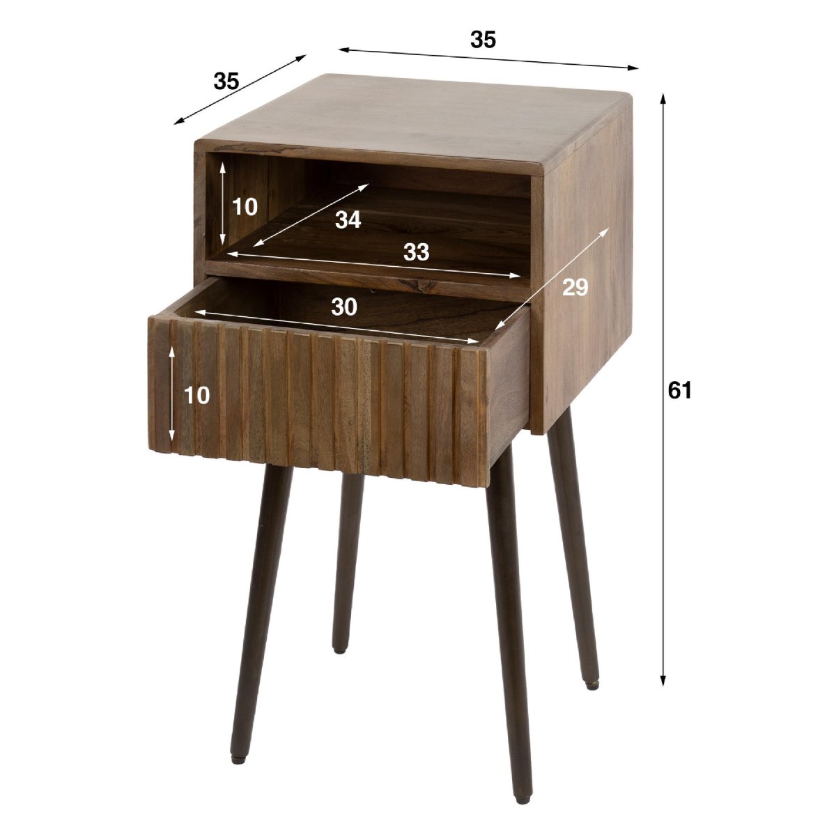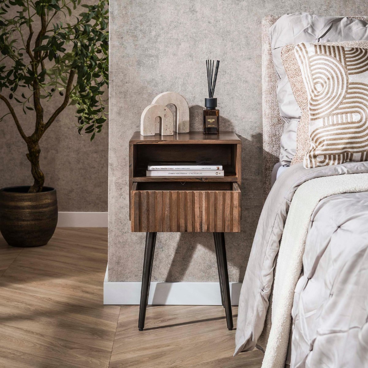 Dit stijlvolle nachtkastje van massief acaciahout in een warme bruine kleur brengt direct sfeer en karakter in je slaapkamer. Dankzij het compacte formaat past dit nachtkastje moeiteloos naast vrijwel ieder bed of boxspring, terwijl je toch verrassend veel opbergruimte hebt. De combinatie van natuurlijk hout, een praktische lade en een open vak maakt dit nachtkastje ideaal voor het netjes opbergen van boeken, je bril, opladers, sieraden en andere dagelijkse benodigdheden. Het metalen onderstel in bronstint geeft het kastje een moderne, stoere én tijdloze uitstraling, waardoor het perfect aansluit bij een industrieel, Scandinavisch of landelijk slaapkamerinterieur.