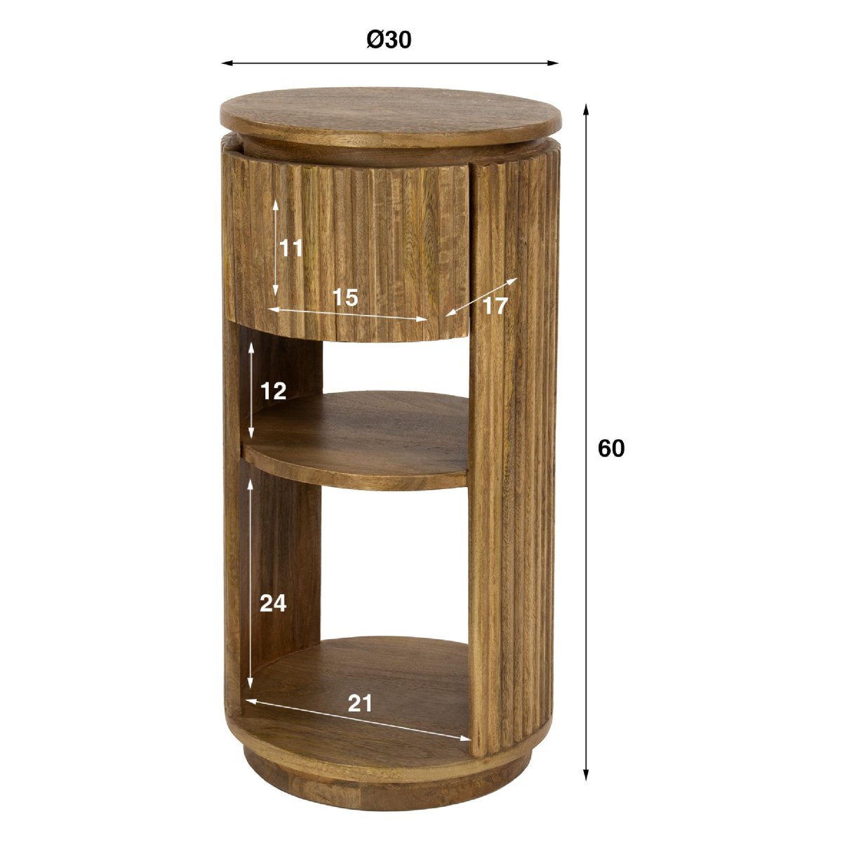 Dit ronde nachtkastje van Nest of Nora is een echte blikvanger naast je bed of bank. Het compacte design van massief mangohout met een zandkleurige afwerking sluit perfect aan bij een modern, Scandinavisch, boho of hotel chique interieur. De subtiele houtstructuur en het golvende patroon rondom zorgen voor een luxe uitstraling en geven het kastje een uniek karakter. Dankzij de praktische indeling met een lade en twee open vakken heb je volop ruimte om boeken, opladers, brillen en andere essentials netjes op te bergen. Dit houten nachtkastje is veelzijdig te gebruiken: als nachtkastje in de slaapkamer, stijlvolle bijzettafel in de woonkamer of praktisch opbergkastje in de hal.