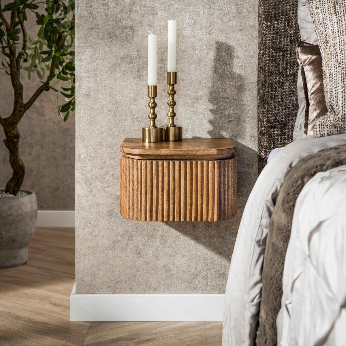 De voor- en zijkanten van dit nachtkastje zijn afgewerkt met een subtiel verticaal golfpatroon. Dit verfijnde lijnenspel geeft het meubel een rustige, gestructureerde en moderne uitstraling, zonder overheersend te zijn. Zo voeg je op een subtiele manier karakter en diepte toe aan je slaapkamer, terwijl de basis sereen blijft. Het reliëf in het hout zorgt voor een mooi spel van licht en schaduw, vooral in combinatie met een nachtlampje of indirecte verlichting. Doordat het patroon rondom doorloopt, staat dit nachtkastje zowel links als rechts van het bed prachtig. Zo kies je voor een uniek, maar ingetogen design dat jaren mee kan.