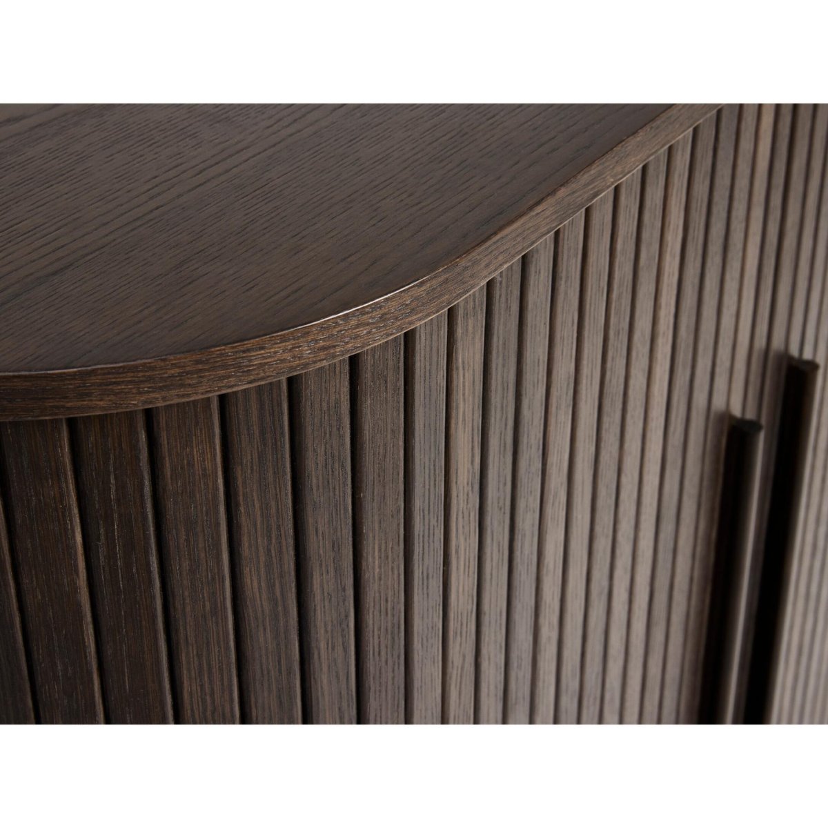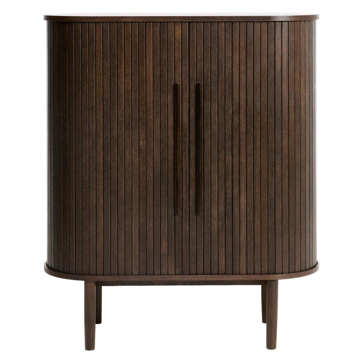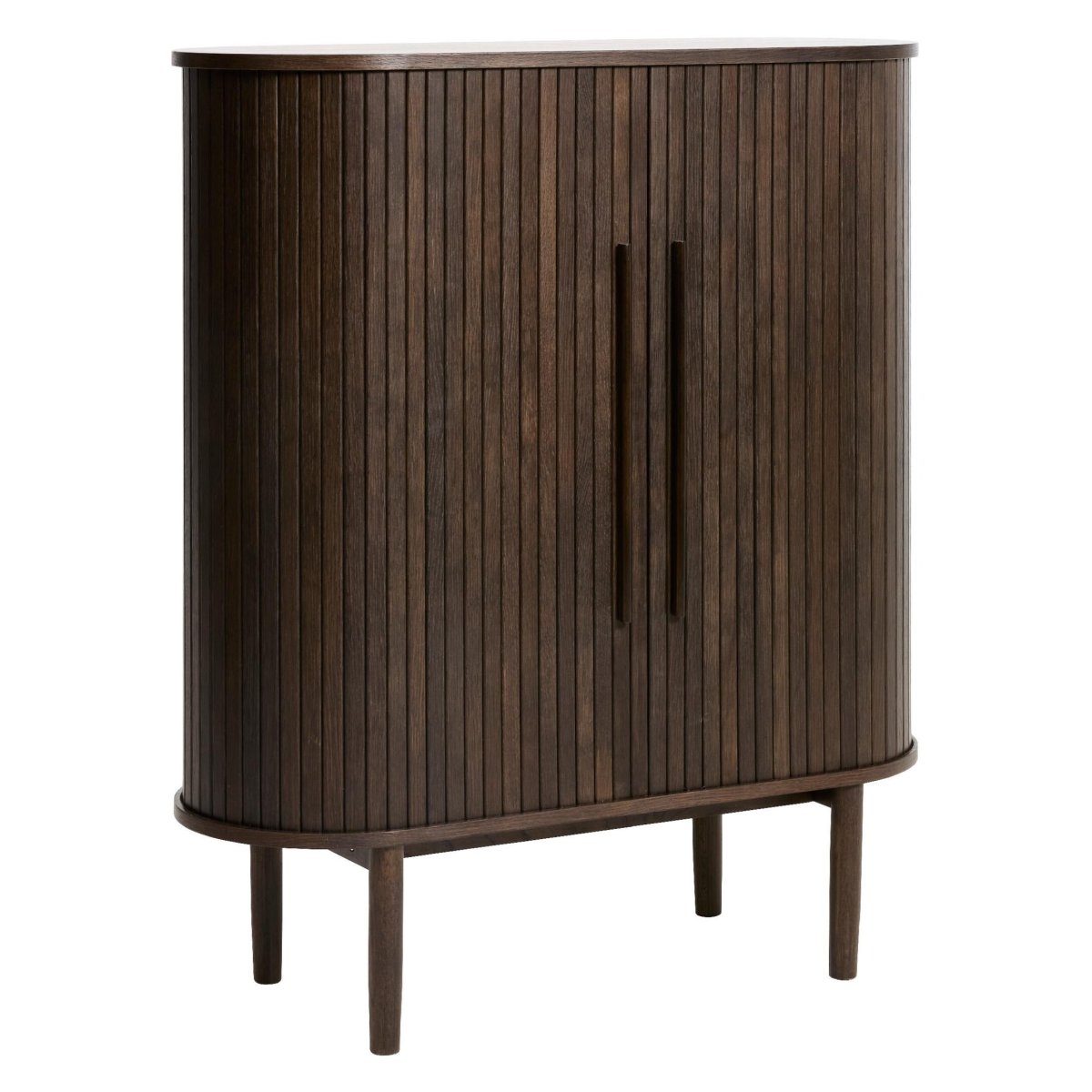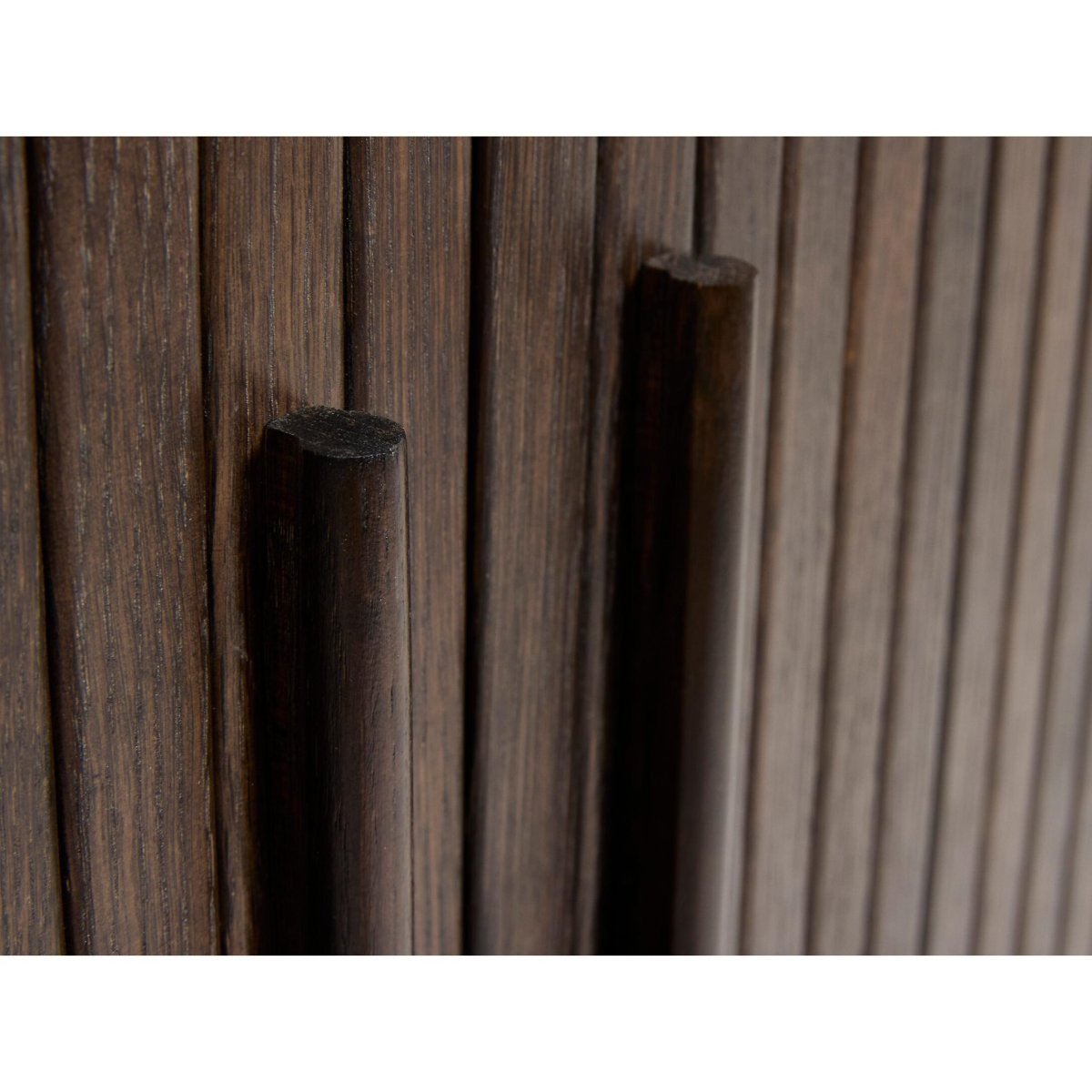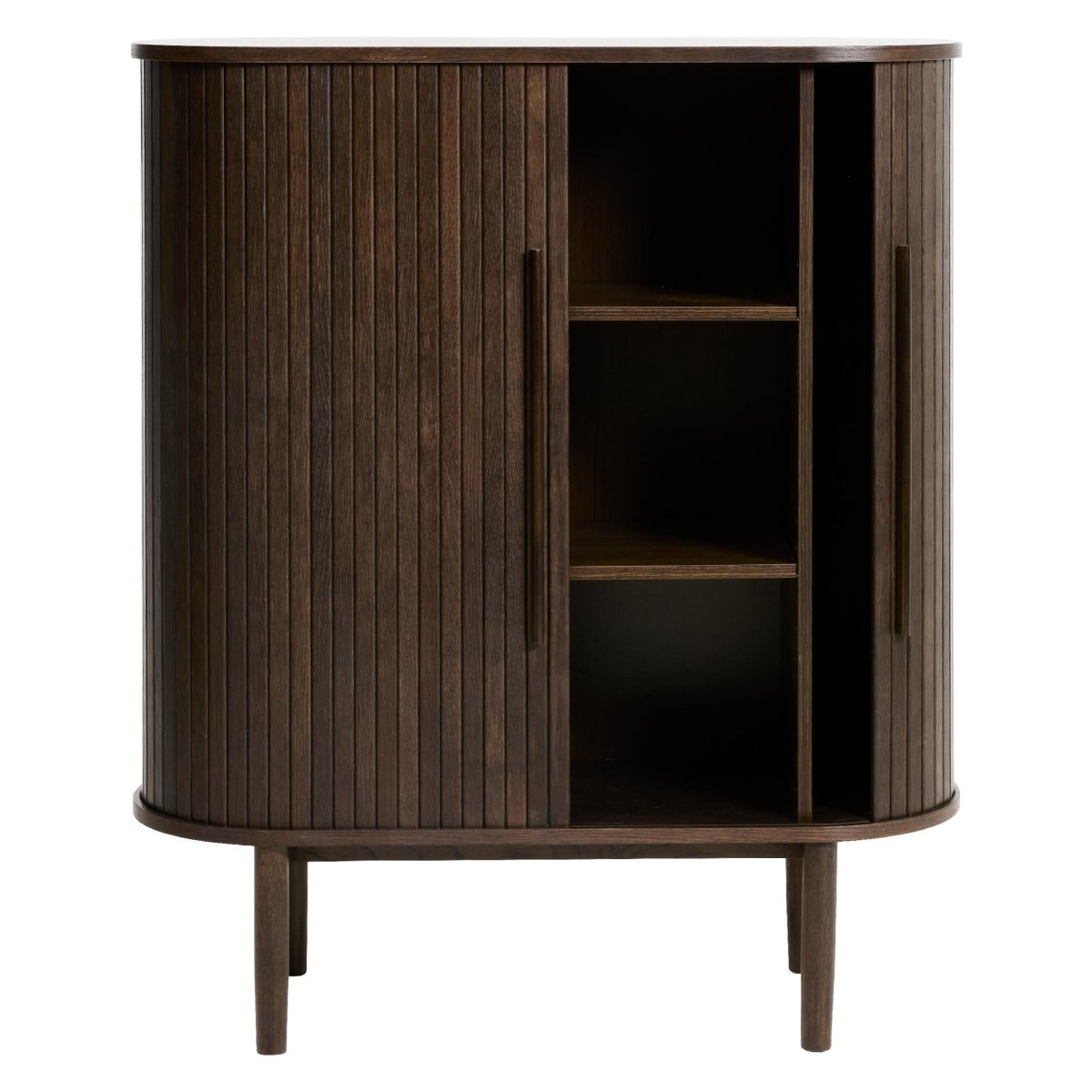 Deze elegante opbergkast van eikenhoutfineer in diep espresso-donkerbruin brengt direct warmte, rust en een vleug luxe in je interieur. De compacte kast met schuifdeuren en verticale lamellen biedt verrassend veel opbergruimte voor servies, glaswerk, tafellinnen en woonaccessoires. Door de afgeronde hoeken, lange handgrepen en het slanke onderstel oogt het design luchtig, modern en niet massief. Perfect als opbergmeubel in de woonkamer, eetkamer of keuken, en dankzij de duurzame PU-lak eenvoudig schoon te houden. De combinatie van robuust ogende eiken details, een slimme indeling en tijdloos design maakt dit meubel een praktische keuze voor uiteenlopende woonstijlen, van modern tot Scandinavisch en Japandi.