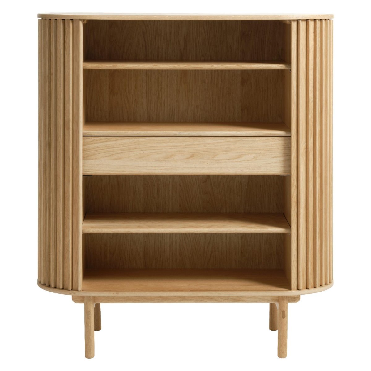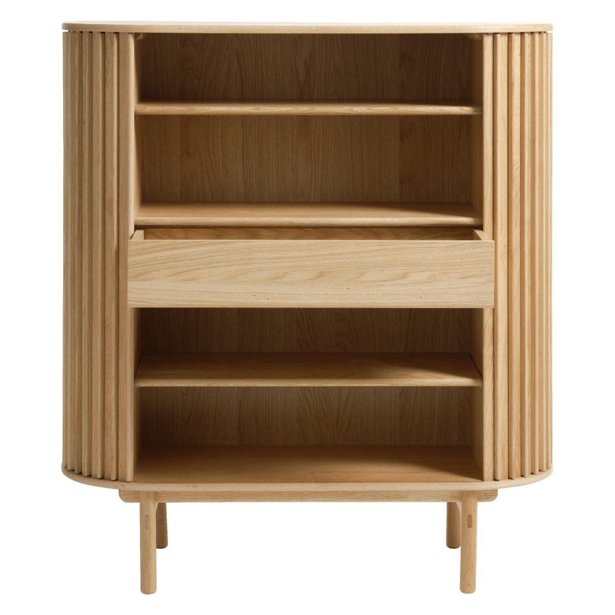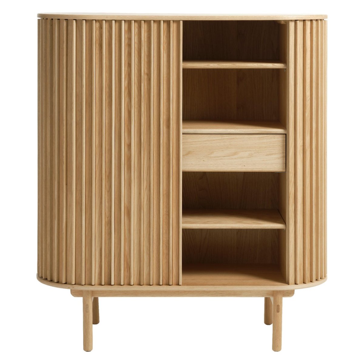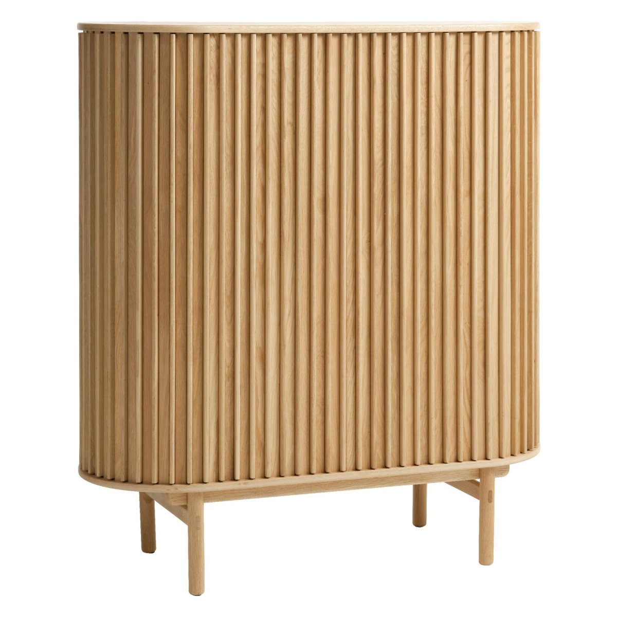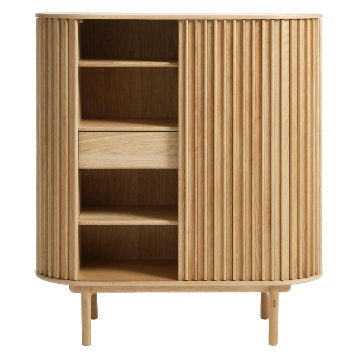 Een elegante opbergkast voor je woonkamer, hal of slaapkamer met een zacht ovaal silhouet en een modern lattenfront. Deze kast in natural eikenfineer verenigt hoogwaardig design met praktische opbergruimte: twee soepele schuifdeuren, één lade met softclose en drie legplanken (waarvan twee verstelbaar) zorgen voor structuur en overzicht. De mat gelakte afwerking geeft het meubel een rustige, eigentijdse uitstraling. Met een hoogte van 125 cm, een lengte van 110 cm en een diepte van 45 cm schuif je deze kast makkelijk tegen de wand, terwijl hij royaal plek biedt aan servies, boeken, linnengoed of woonaccessoires.