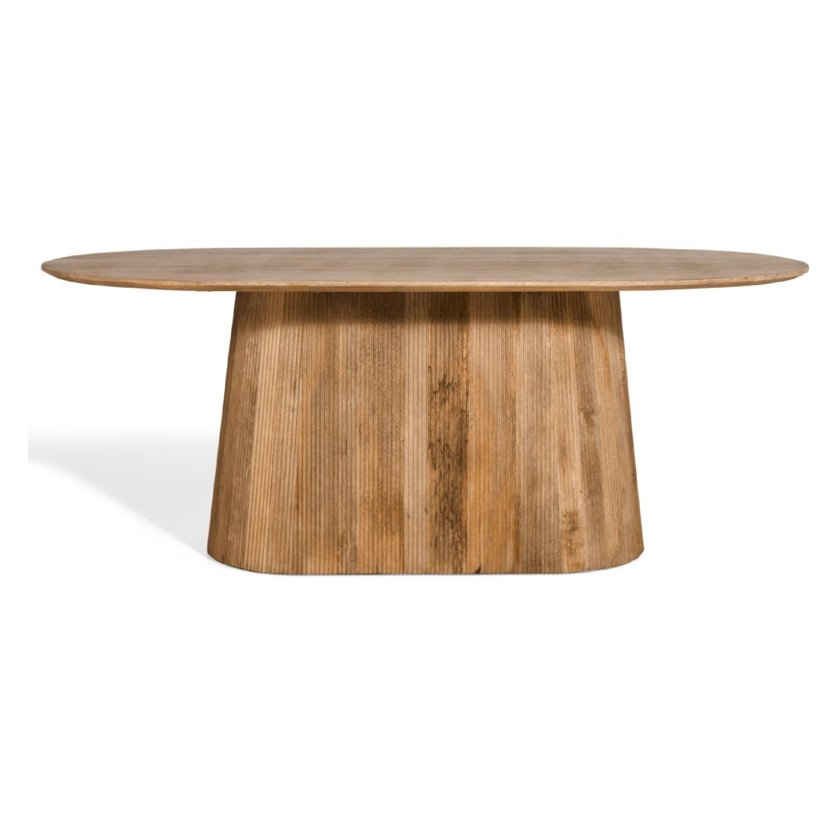 Het onderstel van deze ovale eetkamertafel is een echte blikvanger dankzij het verfijnde ribpatroon dat diepte, ritme en een luxe uitstraling geeft. De centrale pootconstructie is niet alleen een stijlvol statement, maar biedt ook uitstekende stabiliteit over de volledige lengte van het blad. Doordat er geen tafelpoten op de hoeken zitten, schuif je stoelen eenvoudig aan en blijft de beenruimte optimaal, ideaal voor langere diners en werkmomenten. De vorm van de poot oogt slank en elegant, terwijl hij in het dagelijks gebruik zeer stevig en betrouwbaar aanvoelt. Combineer de tafel met een langwerpig tafelkleed, een minimalistische tafelloper of enkele rustige accessoires om het lijnenspel en de ribstructuur extra te benadrukken. Samen met het lichte mangohout ontstaat een verfijnde, moderne eetopstelling met Scandinavische touch, die lang actueel blijft en eenvoudig te stylen is met verschillende soorten eetkamerstoelen en woonaccessoires.