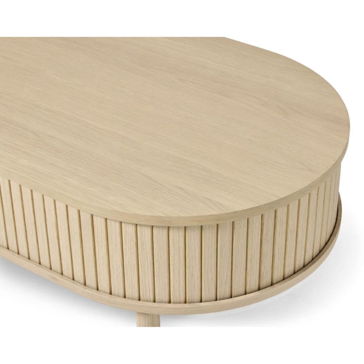 Deze ovale salontafel met opbergruimte combineert een luchtig, Scandinavisch design met slimme functionaliteit. De naturel eiken look, verticale lameldeuren en vier stevige poten geven je zithoek een moderne, rustige uitstraling. Achter de twee deuren berg je tijdschriften, afstandsbedieningen, opladers en andere accessoires overzichtelijk en uit het zicht op. Het ovale tafelblad zorgt voor een zachte, vloeiende vorm en biedt comfortabele loopruimte rond bank en fauteuil. Dankzij de neutrale beige tint, white pigmented lak en slanke proporties past deze ovale salontafel moeiteloos in een minimalistisch, landelijk, Scandinavisch of modern interieur. Ideaal als salontafel of lage koffietafel voor wie stijlvol wil wonen én extra opbergruimte wil creëren.