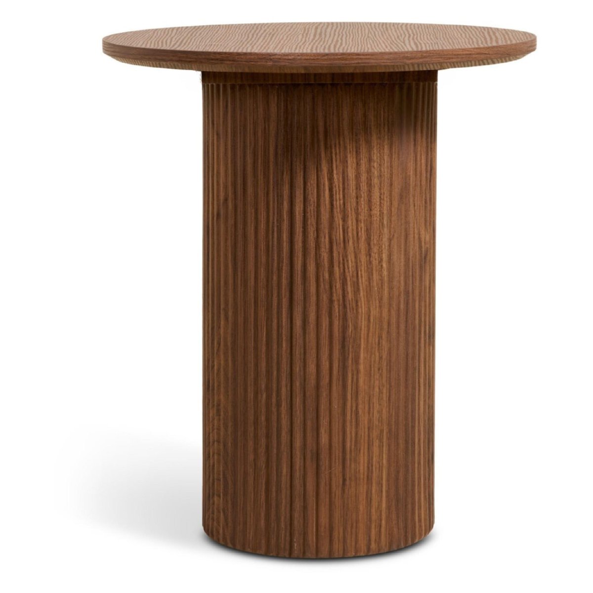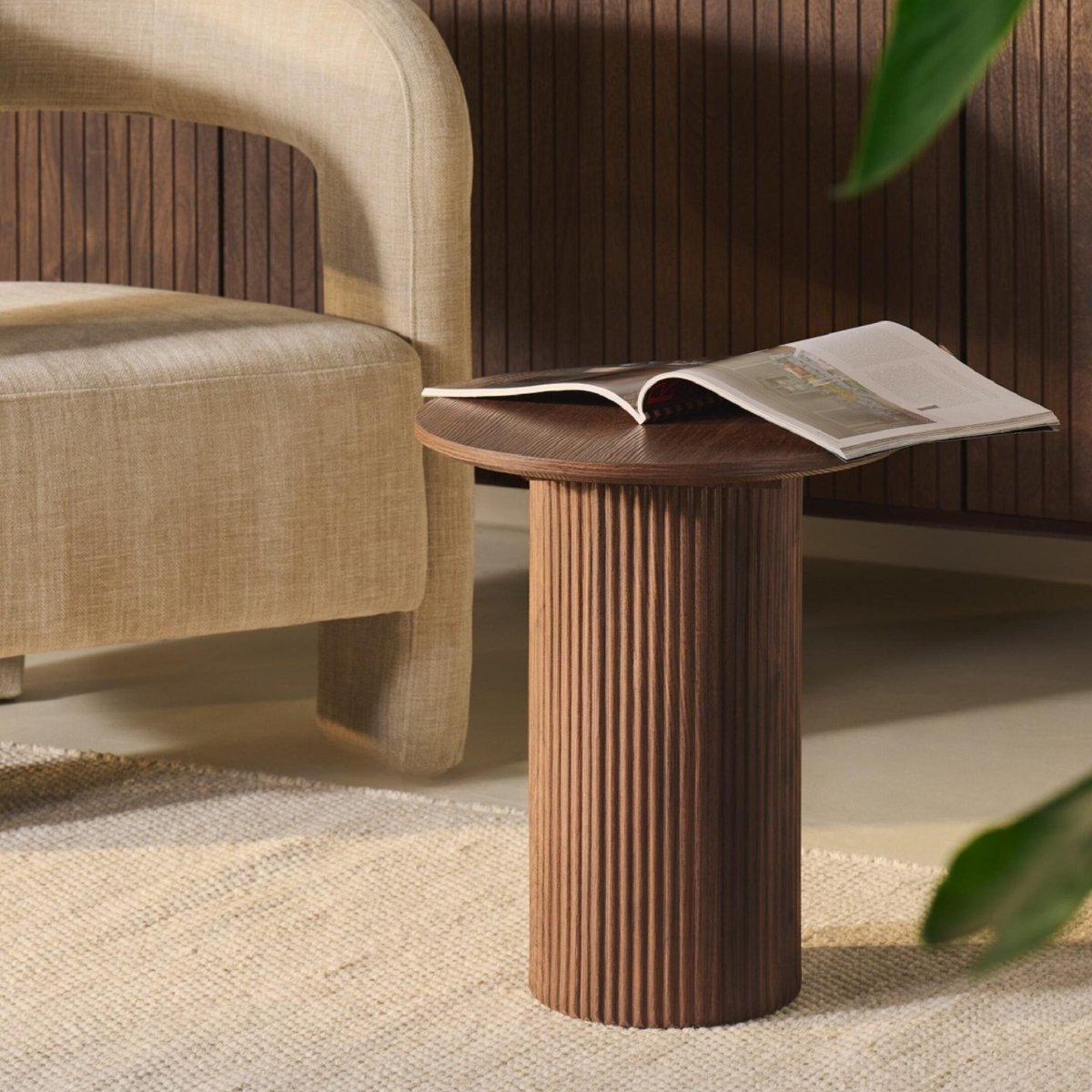 De luxe ribbelpoot met fijne verticale groeven maakt deze ronde bijzettafel direct herkenbaar en geeft het ontwerp een high-end, designgerichte uitstraling. De decoratieve ribbelstructuur voegt ritme, textuur en diepte toe, zonder dat het geheel druk oogt. Het ronde onderstel biedt een stabiele basis en ondersteunt het blad gelijkmatig, zodat je accessoires, drankjes en decoratie stevig en veilig staan. Door de ribbelstructuur ontstaat een subtiel lichtspel, wat vooral bij daglicht een extra dimensie en dynamiek geeft aan de poot. De combinatie van de moderne vormgeving met de warme walnootkleur zorgt voor een perfecte balans tussen luxe en gezelligheid. Hierdoor past de tafel uitstekend in een modern interieur, maar ook in een Scandinavische setting, Japandi stijl of een chic, hotelwaardig woonconcept.