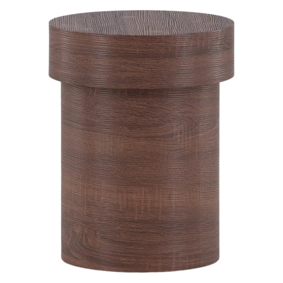 Deze ronde bijzettafel springt direct in het oog door de afgeronde vormen en het minimalistische design. De cilindervorm met twee niveaus zorgt voor extra diepte en een speels silhouet dat mooi contrasteert met rechte banken, fauteuils en kasten. De warme bruine tint brengt sfeer in de ruimte en laat je decoratie, boeken, geurkaarsen of een vaas met bloemen extra opvallen. Dankzij het gladde MDF-oppervlak oogt het blad strak en egaal, wat rust en eenheid creëert in je interieurstyling. Gebruik het tafeltje solo als subtiele blikvanger, of plaats er twee naast elkaar voor een stijlvol, gelaagd effect. Zo voeg je design én functionaliteit toe zonder dat het druk of rommelig oogt.