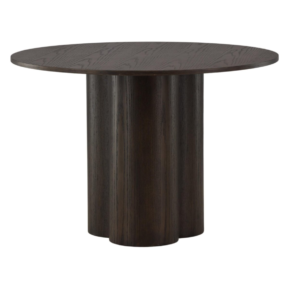 Deze ronde eettafel in mocca is een compacte, maar stijlvolle eyecatcher voor eetkamer of keuken. Dankzij het Scandinavische design, de strakke lijnen en de warme bruine kleur past deze ronde tafel moeiteloos in zowel moderne als tijdloze interieurs. Het dunne, ronde tafelblad oogt licht en elegant, terwijl het centrale onderstel met drie cilindervormige poten zorgt voor optimale stabiliteit én veel beenruimte. Met een diameter van 110 cm creëer je een gezellige zitplek voor het gezin of vrienden, zonder hoeken of scherpe randen. Het MDF met fineer laat subtiel de houtnerf zien, waardoor de tafel een natuurlijke, hoogwaardige uitstraling krijgt. Ideaal als ronde eetkamertafel of keukentafel voor dagelijks gebruik, thuiswerken en uitgebreid tafelen.