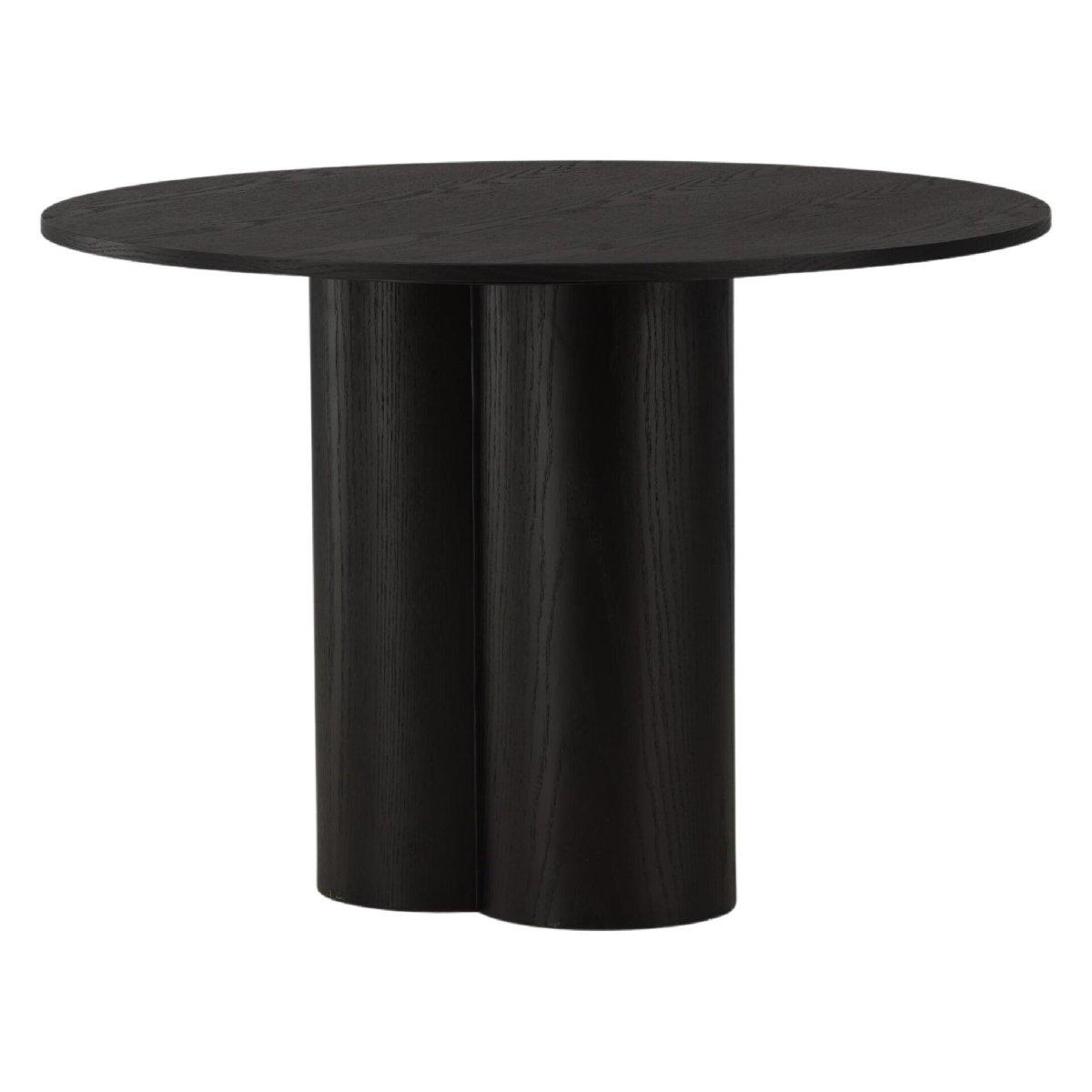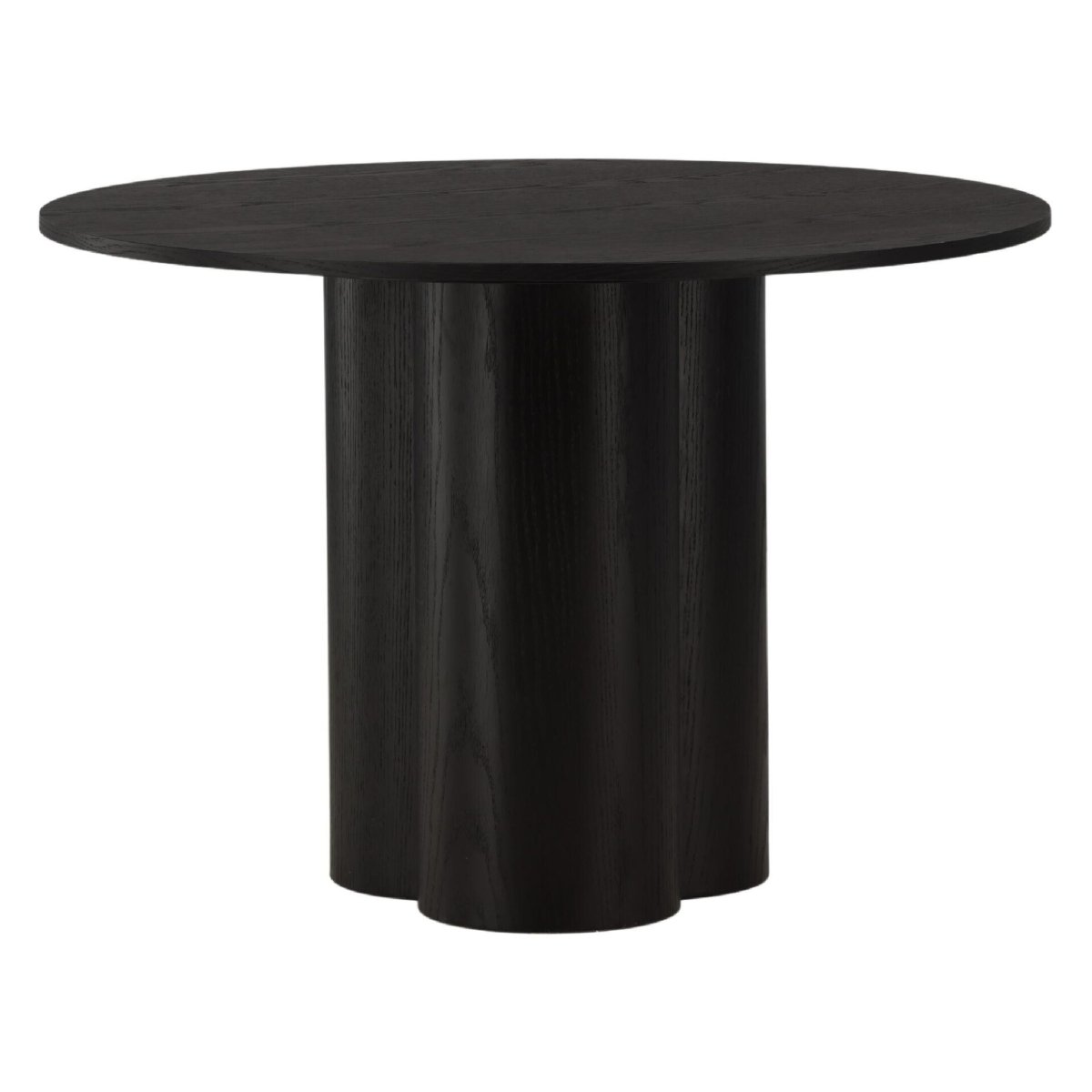 Deze zwarte ronde eettafel ademt rust, ruimte en harmonie dankzij het ronde blad en de strakke, zachte lijnen. Het dunne profiel oogt licht en luchtig, waardoor de ruimte optisch groter lijkt en je eethoek een rustige, opgeruimde uitstraling krijgt. De drie cilindrische poten komen samen in het midden en geven de tafel een grafische, bijna architectonische look die perfect past bij Scandinavische, moderne en minimalistische interieurs. Het zwarte fineer met zichtbare houtstructuur zorgt voor een warme, huiselijke sfeer, zodat de zwarte eettafel niet koel maar juist chic en uitnodigend oogt. Combineer deze design eettafel met stoffen of leren eetkamerstoelen, of ga voor een mix-and-match van kleuren en materialen voor een speelse, eigentijdse eetruimte.