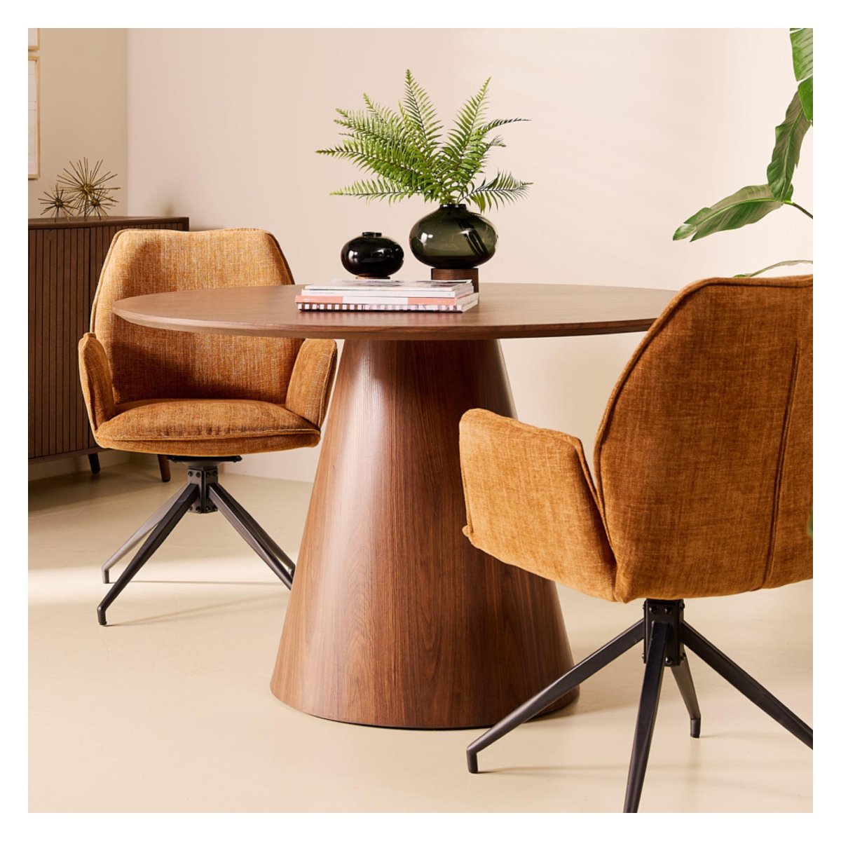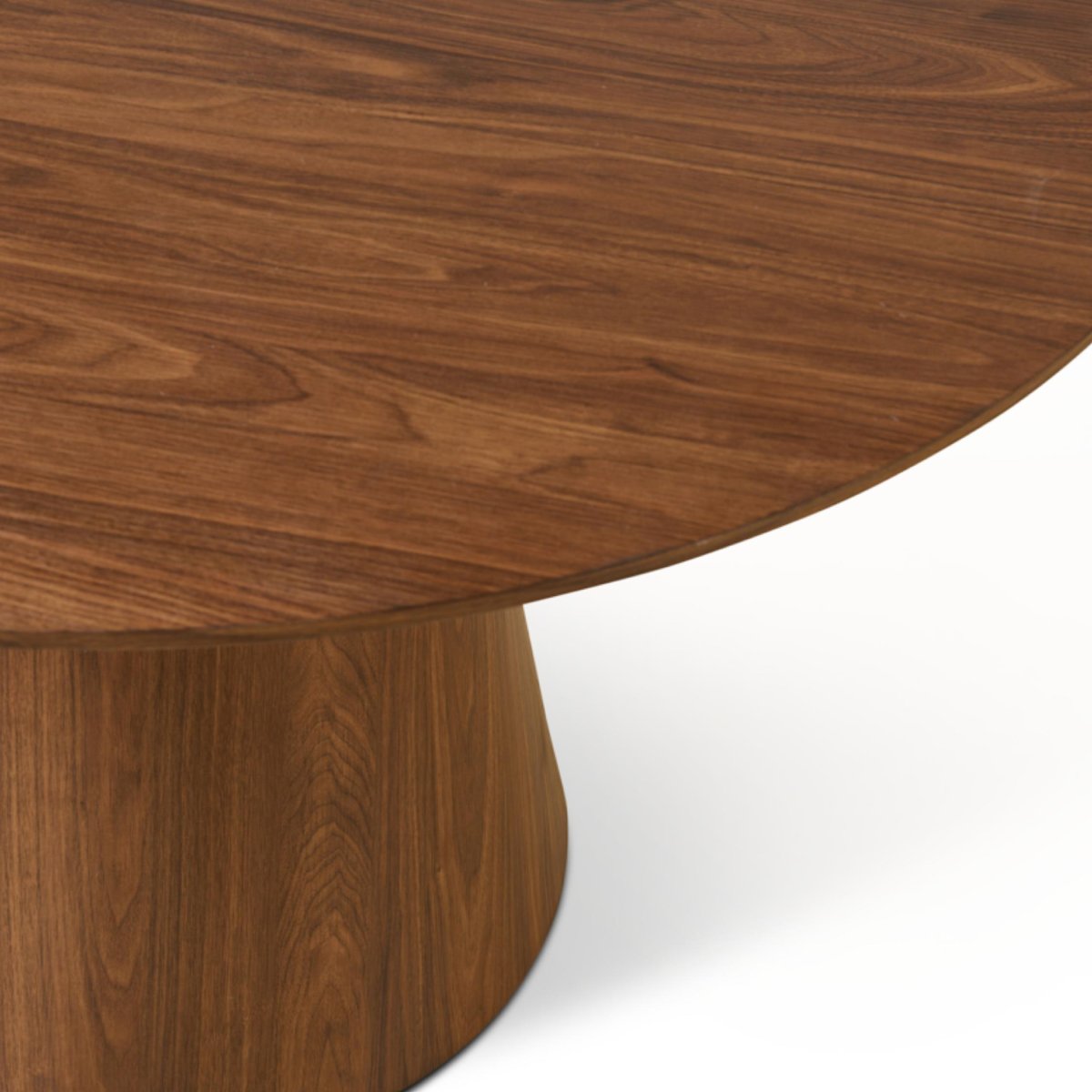 De stevige, kegelvormige middenpoot geeft deze ronde eettafel niet alleen een strakke, designvolle uitstraling, maar vooral uitstekende stabiliteit. Je plaatst stoelen flexibel rondom de tafel zonder last te hebben van poten op de hoeken, ideaal als je vaak schuift met opstellingen of gasten ontvangt. Servies, glazen en decoratie staan betrouwbaar dankzij het solide onderstel. Het onderhoud is eenvoudig: maak het blad schoon met een licht vochtige doek en droog na met een zachte doek. Gebruik onderzetters en placemats om de walnootlook en de gladde afwerking langdurig mooi te houden. Zo geniet je van een ronde eettafel die gebruiksgemak, stabiliteit en een hoogwaardige, moderne uitstraling naadloos combineert.