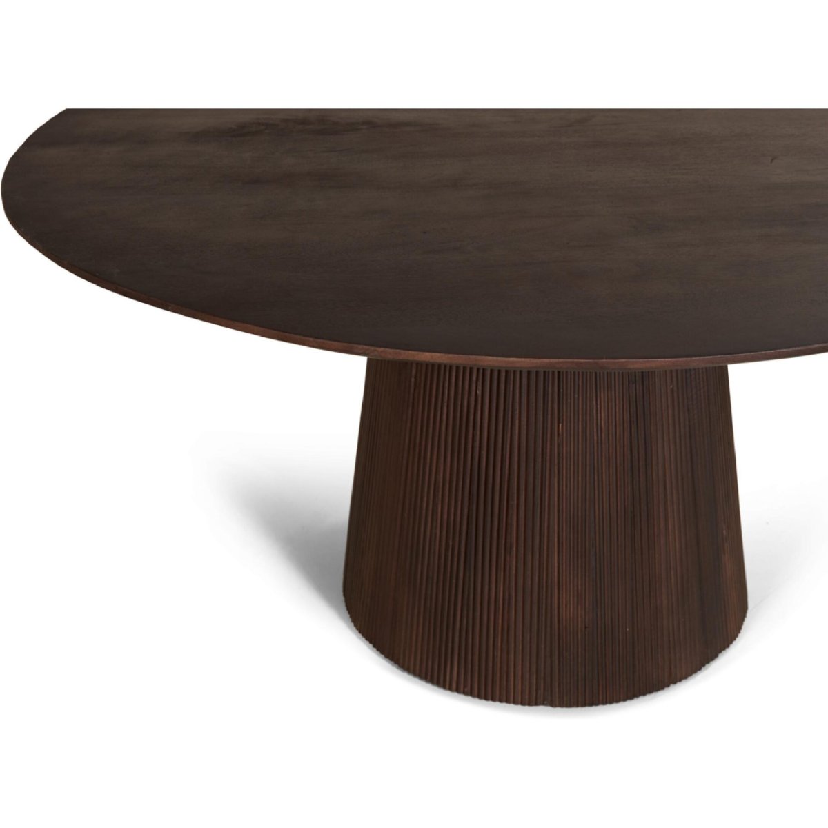 Een royale, ronde eettafel van massief mangohout met een diameter van 150 cm, afgewerkt in diep donkerbruin voor een warme, luxe en moderne uitstraling. Het handbewerkte tafelblad (25 mm) met verfijnde Swiss edge rand rust op een stevige, geribbelde kolompoot die veel beenruimte biedt. Door de royale ronde vorm kun je met 5-6 personen comfortabel, gezellig én ruimte-efficiënt tafelen. Deze grote ronde eettafel combineert de natuurlijke houtnerf met eigentijds design en past moeiteloos in zowel eetkamer als woonkeuken. Ideaal als dagelijks gebruikte houten eettafel én voor lange, sfeervolle avonden tafelen.