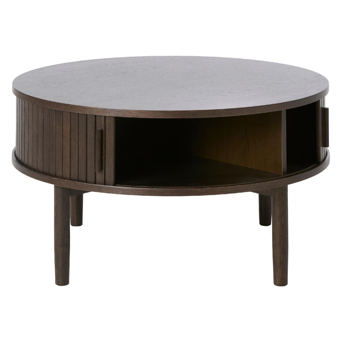 De ronde salontafelvorm creëert een zachte, uitnodigende sfeer en maakt bewegen rondom de tafel comfortabel en veilig, zelfs in kleinere woonkamers of gezinnen met kinderen. Het eikenhout fineer in dark espresso voegt warmte, diepte en luxe toe aan je interieur, zonder te overheersen. De geïntegreerde opbergruimte is een groot pluspunt: twee open vakken voor koffietafelboeken, stylingobjecten, trays of gadgets en twee gesloten vakken om opladers, spelletjes, kabels en andere rommeltjes uit het zicht op te bergen. Zo blijft je salontafel opgeruimd en strak, terwijl je dagelijkse items toch binnen handbereik zijn. Door de combinatie van decoratieve koffietafel en verborgen opbergmogelijkheden vervangt deze ronde salontafel moeiteloos een klein dressoir, ideaal voor liefhebbers van een minimalistische, moderne of tijdloos klassieke woonstijl.