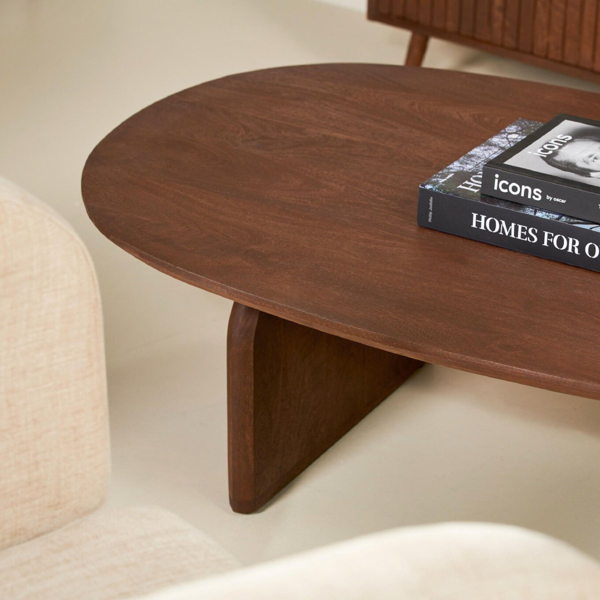 Een organische salontafel van massief mangohout met een luxe Tabacco afwerking die direct warmte, sfeer én stijl toevoegt aan je woonkamer. Het donkerbruine, open geborstelde tafelblad laat de natuurlijke houtnerf rijk en levendig uitkomen, terwijl de zachte, organische rondingen zorgen voor een vriendelijke, Scandinavische uitstraling. Door het royale blad heb je meer dan genoeg ruimte voor koffiekopjes, een mooi koffietafelboek, een vaas en stijlvolle woonaccessoires. Deze mangohouten koffietafel combineert pure, natuurlijke charme met eigentijds design en sluit moeiteloos aan bij lichte en donkere interieurs, van scandi en modern tot hotel chique.
